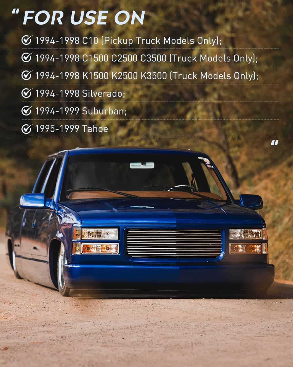Este artículo no es un producto con licencia de Blazer/C10/CK Series/Silverado/Suburban/Tahoe. No reclamamos propiedad y no tenemos afiliación con los derechos de autor y marcas registradas de Blazer/C10/CK Series/Silverado/Suburban/Tahoe pertenecientes a los respectivos propietarios. A menos que se identifique específicamente como tal, nuestro uso de marcas comerciales de terceros no indica ninguna relación, patrocinio o respaldo entre nosotros y las marcas Blazer/C10/CK Series/Silverado/Suburban/Tahoe. Cualquier referencia de nuestra parte a marcas comerciales de terceros es para identificar los productos correspondientes de terceros y se considerará un uso justo nominativo bajo la ley de marcas comerciales.