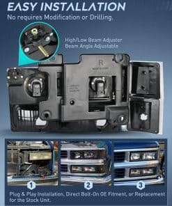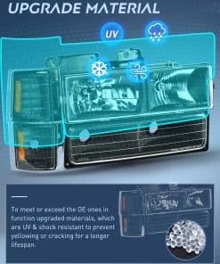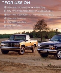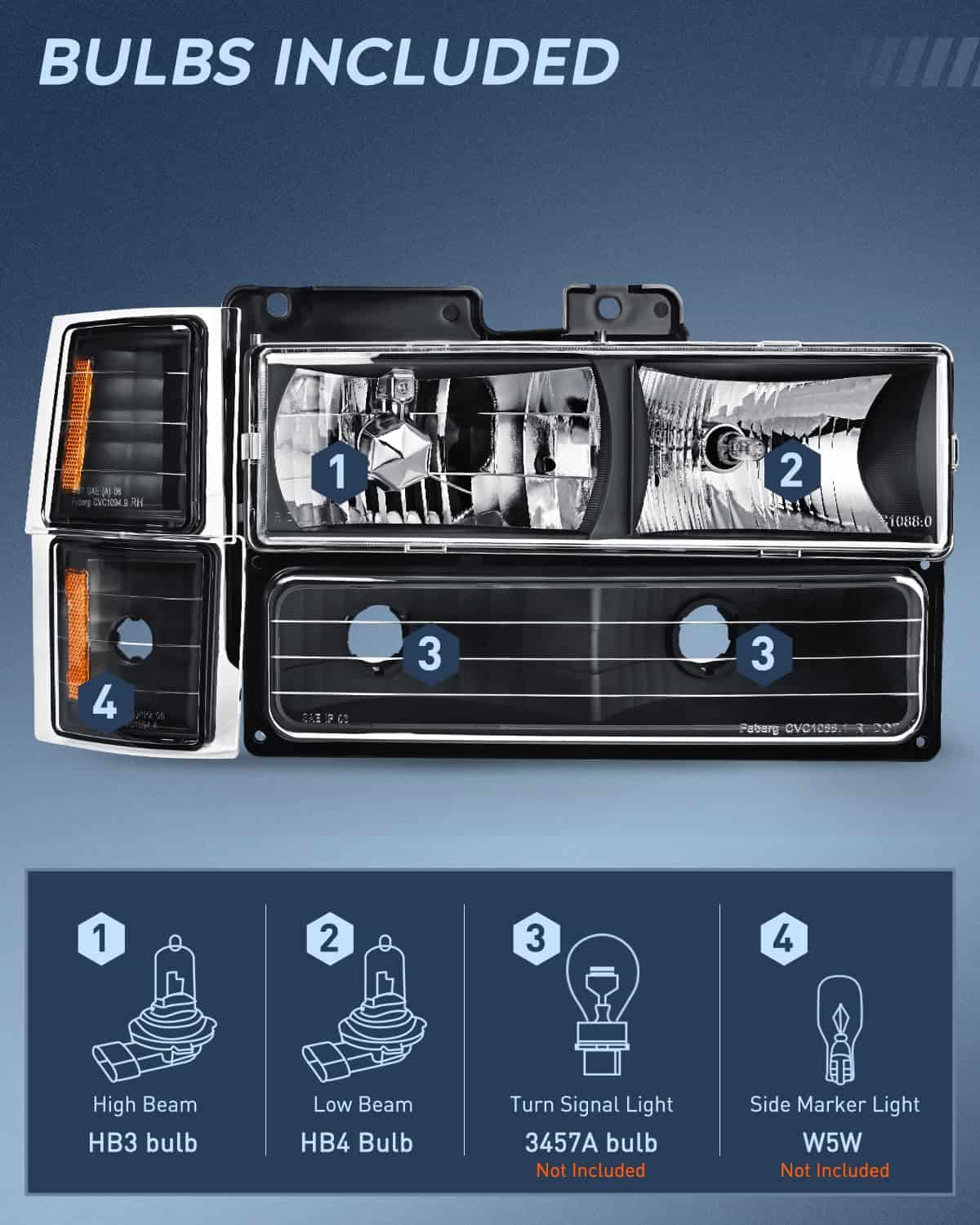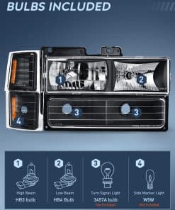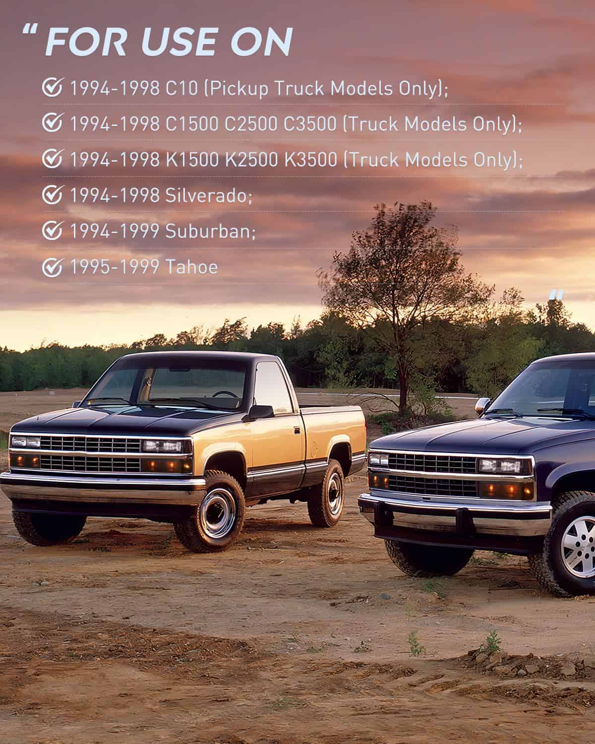 1994-1998 C10 (Modelos de Camioneta Pickup) 1994-1998 C1500 C2500 C3500 (Modelos de Camioneta) 1994-1998 K1500 K2500 K3500 (Modelos de Camioneta) 1994-1998 Silverado 1994-1999 Suburban 1995-1999 Tahoe Alta de Luz HB3 (9005) Baja de Luz: HB4 (9006) (Se incluyen bombillas) Luz de Señal de Giro 3457A Luz de Marcador Lateral W5W (No se incluyen bombillas) Descargo de responsabilidad legal Este producto no es un producto Blazer/C10/CK Series/Silverado/Suburban/Tahoe con licencia. No reclamamos propiedad y no tenemos afiliación con los derechos de autor y marcas registradas de Blazer/C10/CK Series/Silverado/Suburban/Tahoe pertenecientes a los respectivos propietarios. A menos que se identifique específicamente como tal, nuestro uso de marcas registradas de terceros no indica ninguna relación, patrocinio o respaldo entre nosotros y Blazer/C10/CK Series/Silverado/Suburban/Tahoe. Cualquier referencia por nuestra parte (o nombre de la empresa) (o el vendedor) a marcas registradas de terceros es para identificar los bienes correspondientes de terceros y se considerará un uso justo nominativo según la ley de marcas registradas.
