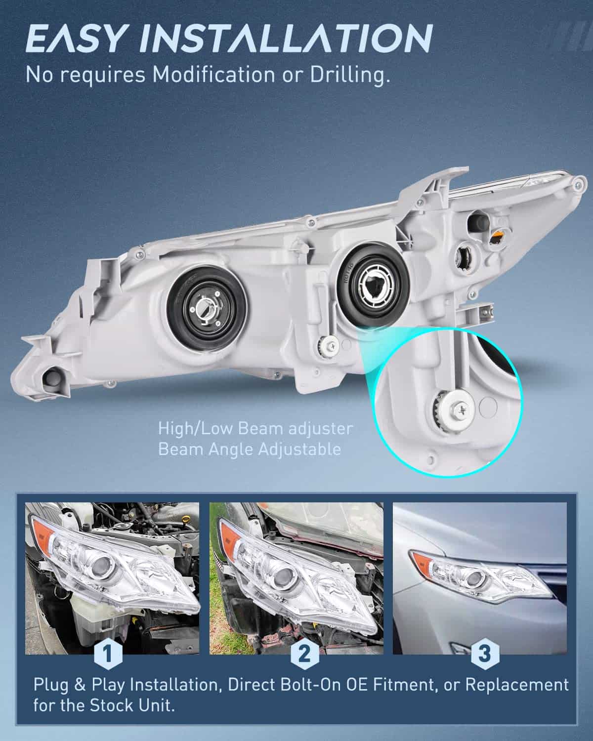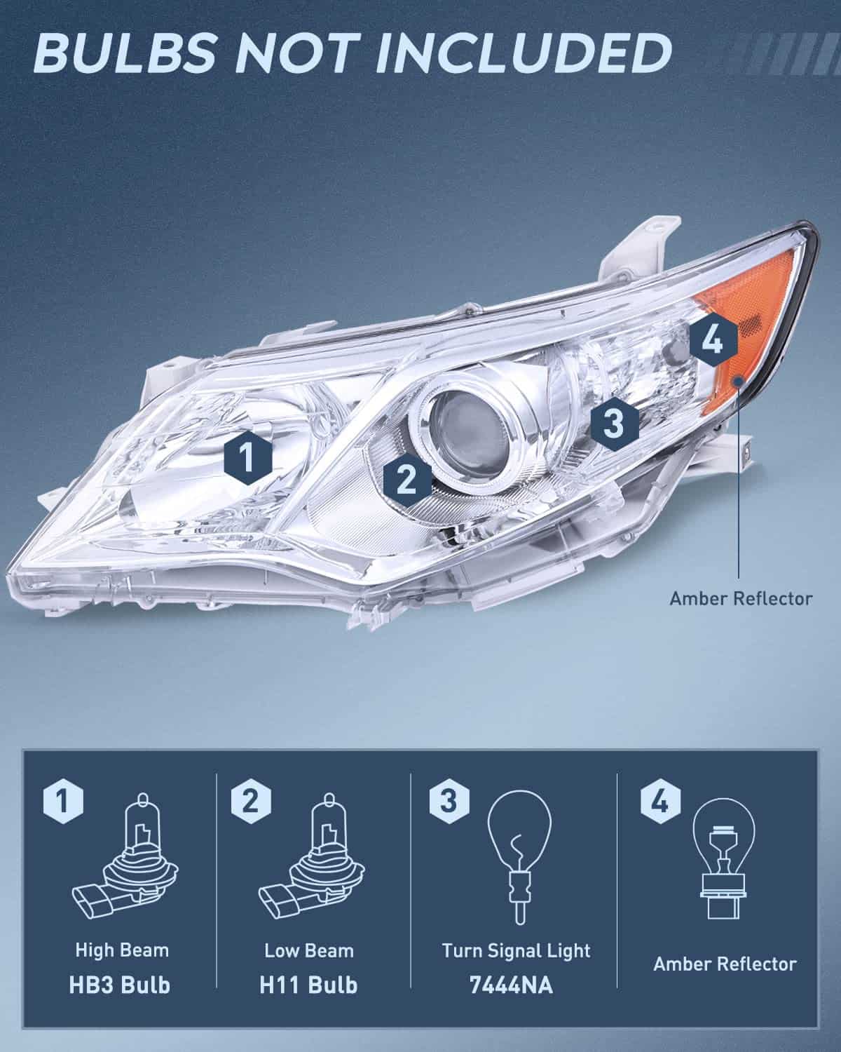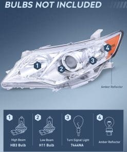 1. Compatibilidad: Los conjuntos de faros son compatibles con Toyota Camry L / LE / XLE / Hybrid LE XLE 2012 2013 2014, no son compatibles con modelos con faros HID de fábrica. Tipo de bombilla de luz alta / baja: HB3/H11 (Las bombillas no están incluidas) Luz de señal de giro: 7444NA (las bombillas no están incluidas), utiliza las bombillas de fábrica para la instalación.