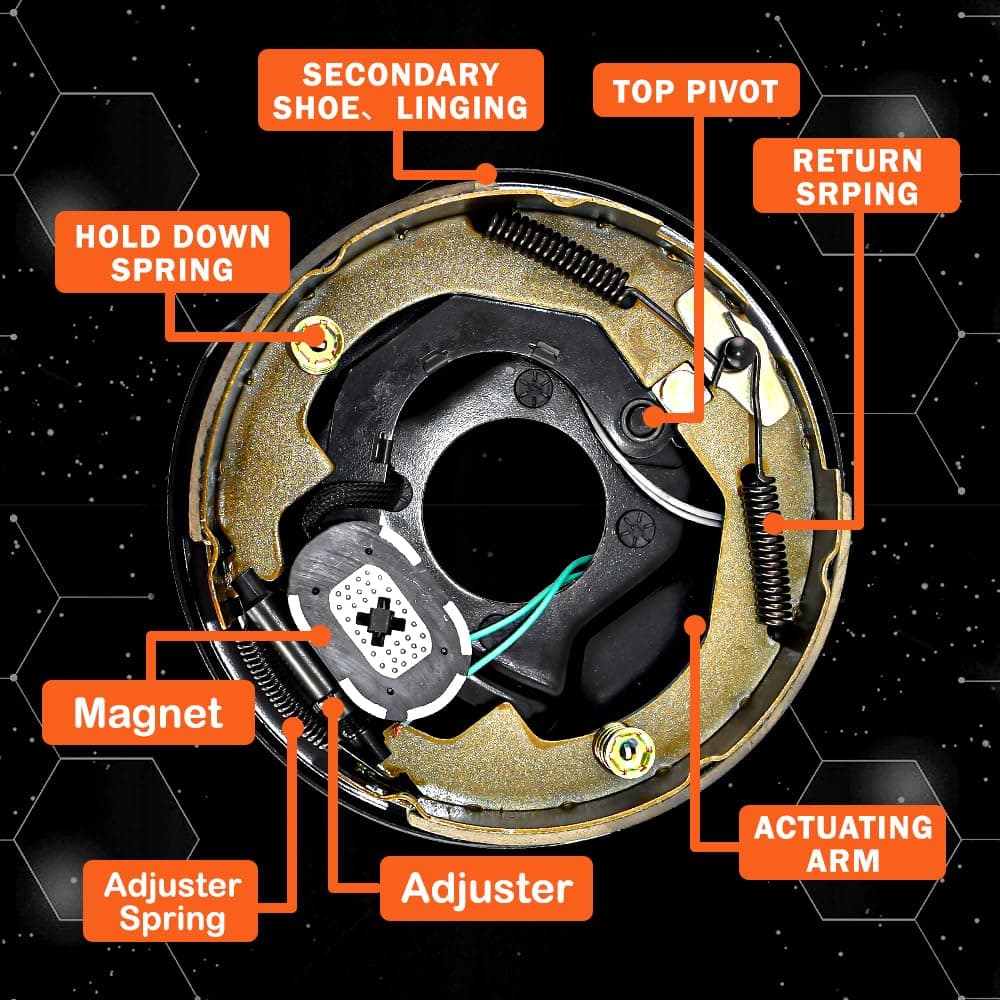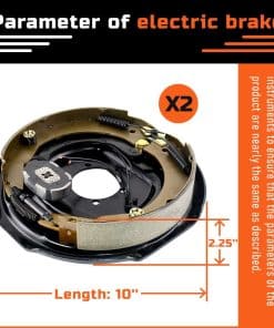 1. AuraWINS 10″ x 2.25″ Conjunto de Freno Eléctrico de Remolque, Diámetro del Orificio Central: 3″, Montaje de 4 Orificios, Diámetro del Círculo de Pernos: 4″, Pernos de Montaje Instalados, No Incluye Tuercas, Contiene 1 Freno Eléctrico de Remolque 10″ x 2.25″ Izquierdo y 1 Derecho.