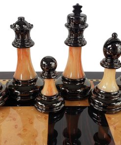 No te pierdas este conjunto de hombres de ajedrez en cromo y negro cromo de plástico con tablero. Los hombres tienen un peso doble y cuentan con almohadillas inferiores de cuero sintético acolchado. El tablero presenta un hermoso laminado de color nogal oscuro y arce con vetas sobre madera mdf. La parte inferior del tablero está completamente forrada. ¡Un set de gran apariencia!