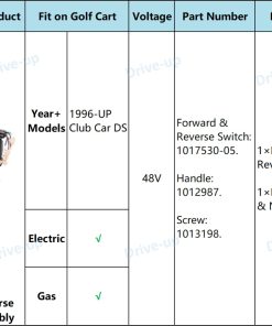 Compatible con los modelos de interruptor de avance y retroceso de 48 voltios Club Car DS del año 1996 en adelante. Incluye interruptor de avance y retroceso resistente, mango y tornillos para una fácil instalación. Asegúrese de verificar el modelo de su carro de golf antes de realizar la compra. Garantía de 1 año para mayor tranquilidad.