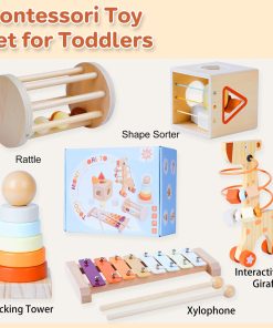 Conjunto de juguetes Montessori de madera Smartwo para niños pequeños de 1-3 años, bebés de 12-18 meses. Este conjunto incluye 5 juguetes clásicos de aprendizaje básico diseñados para apoyar el desarrollo sensorial de los niños en diferentes etapas. Los juguetes incluyen un laberinto de cuentas, un xilófono, un cubo de clasificación de formas, un anillo apilable de madera y un sonajero rodante.