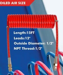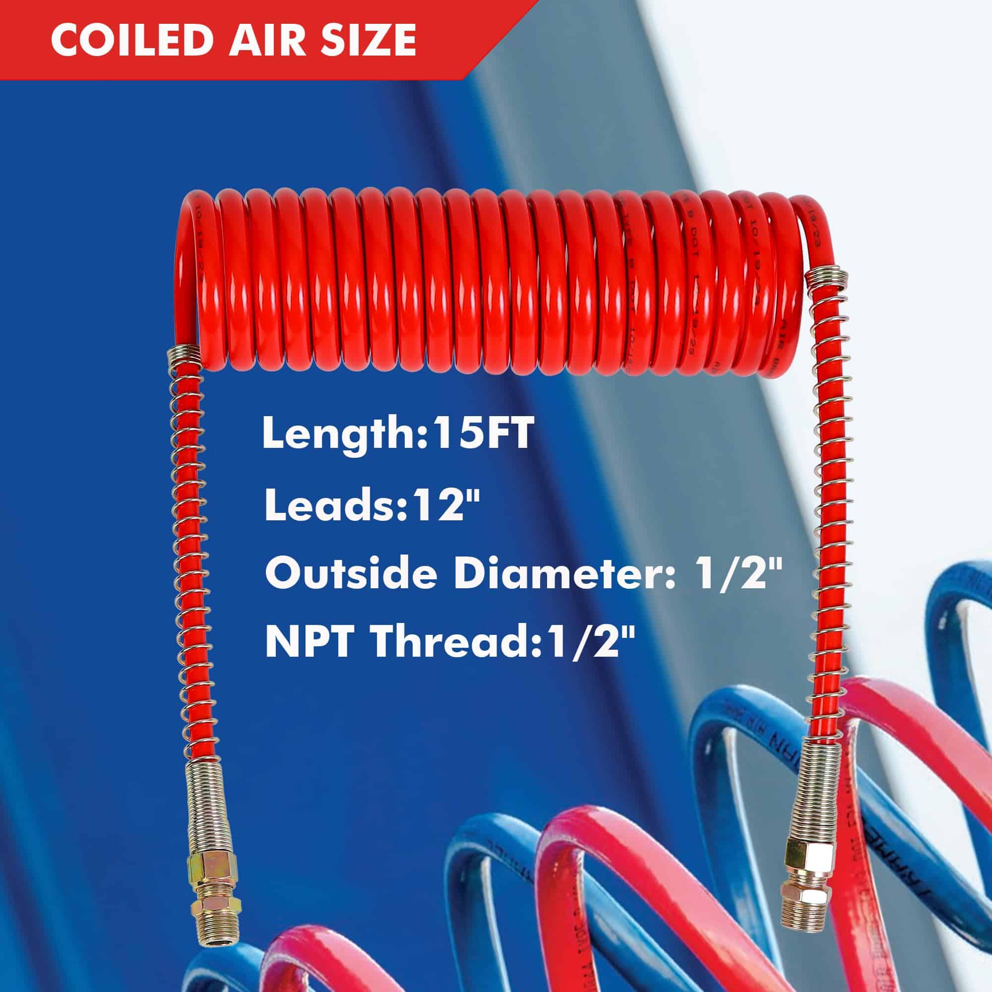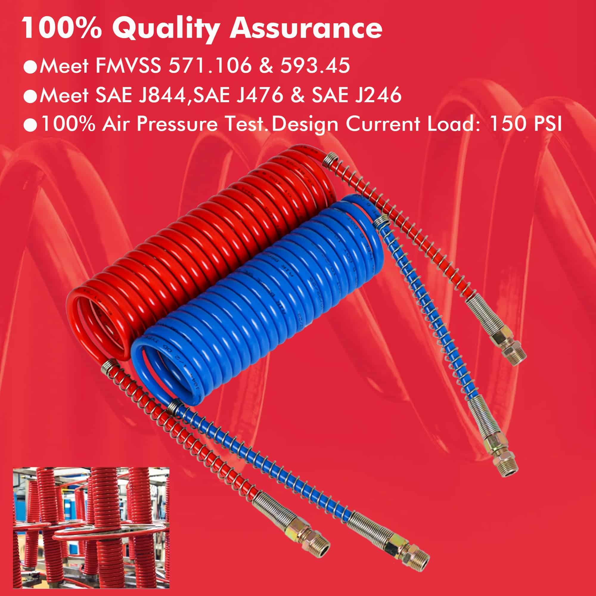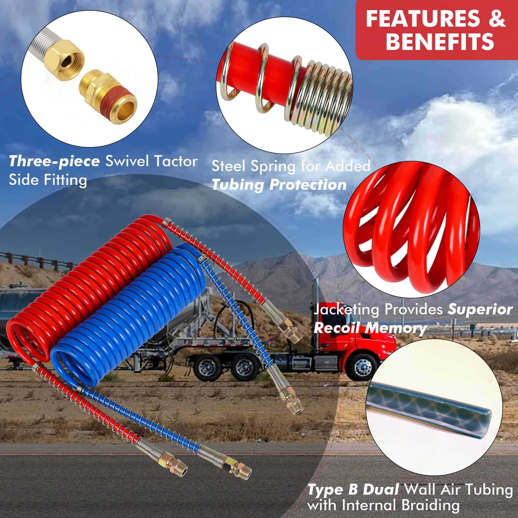 1. Incluye en el Embalaje – Bobinas de freno de aire estándar de doble capa reforzada que incluyen tanto la bobina AZUL – de Servicio como la bobina ROJA – de Emergencia, la manguera en espiral azul para la transmisión de aire comprimido para operaciones de frenado regulares y la manguera en espiral roja está dedicada al sistema de freno de emergencia en camiones y remolques.