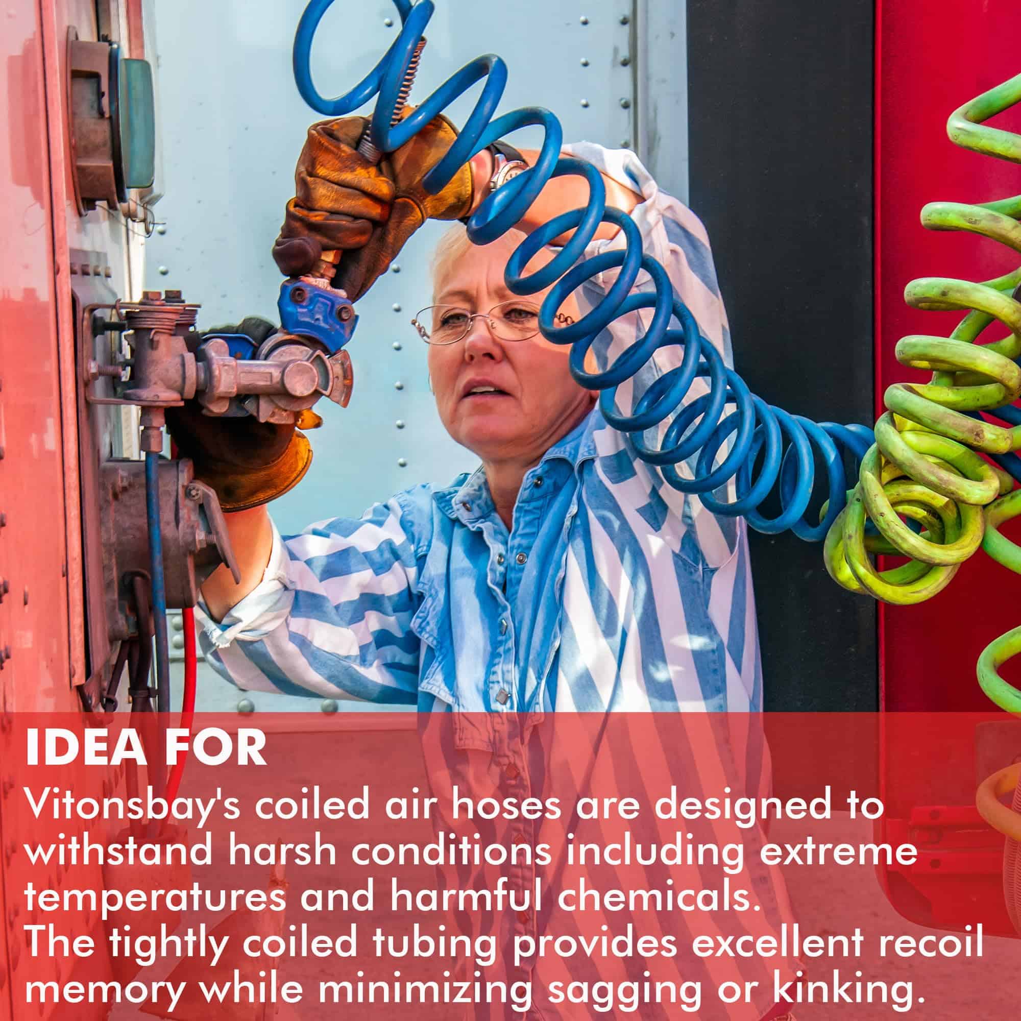5. Flexibilidad y Conveniencia: Excelente memoria de retracción, resistencia química y a la abrasión. El gran diámetro de la bobina evita el doblado y proporciona una mayor retracción. La tubería fuertemente en espiral ofrece una excelente memoria de retracción mientras minimiza el hundimiento o el doblado. La longitud de 15 pies del conjunto de manguera en espiral proporciona un alcance suficiente para conectar el sistema de freno de aire mientras ofrece flexibilidad durante el movimiento y almacenamiento.