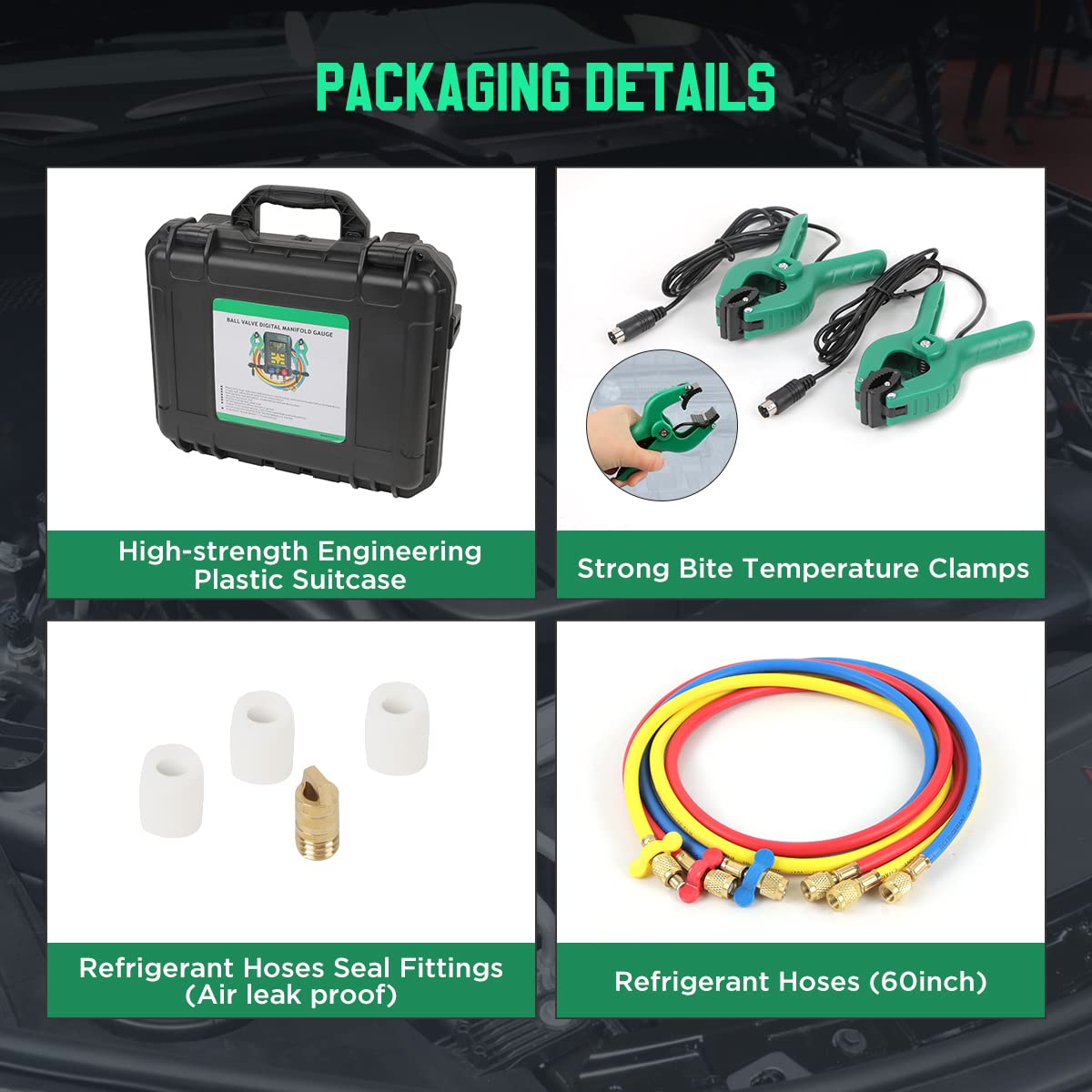 Conjunto de manómetros digitales de detección de refrigerante para HVAC con pantalla LCD de 3.5″, mangueras de refrigerante, clips de temperatura y maletín. Adecuado para probar el aire acondicionado de automóviles, el aire acondicionado doméstico, los equipos de refrigeración, el almacenamiento en frío y otros equipos de refrigeración. El conjunto de manifold digital incorpora una base de datos de 93 refrigerantes para detectar 93 tipos de refrigerantes. Las pruebas de datos se dividen en áreas en la pantalla LCD retroiluminada de 3.5 pulgadas para que puedas leer los datos de un vistazo. – – – La válvula en forma de V mejorada controla la cantidad de llenado de refrigerante de forma más precisa. Las pruebas de temperatura y presión de evaporación/condensación determinan la capacidad de refrigeración y la eficiencia del ciclo de refrigeración. Las pruebas de presión diferenciales determinan si hay fugas de refrigerante. La conexión a una bomba de vacío para la operación de vacío asegura un llenado de refrigerante de mayor pureza y un mejor efecto de refrigeración. Escalas de unidad de presión y temperatura múltiples, unidad de procesamiento digital de 32 bits para un procesamiento de datos más estable. Ventana de observación que te permite observar el estado de carga de refrigerante directamente. Diseño de silicona antideslizante que evita caídas. Incluye clips de temperatura y mangueras de refrigerante. Garantía de 1 año para garantizar tu satisfacción antes y después de la compra. Para cualquier pregunta o duda durante el uso, contáctanos y nuestro equipo técnico profesional te ayudará a resolver el problema en 24 horas.