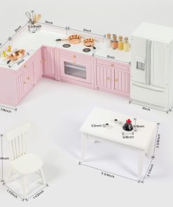 Detalles que incluye 4 gabinetes de madera, 1 mesa de comedor, 4 sillas, 1 refrigerador, 3 sartenes, 4 tarros de condimentos para espaguetis, 1 batidor de huevos, 4 utensilios de cocina de madera, 1 soporte de utensilios de cocina de cerámica, 2 tazas de café, 1 cafetera. Todos ellos se muestran en la Figura 1. El material de los gabinetes, mesa de comedor, sillas, refrigerador y utensilios de cocina es madera. El batidor de huevos y las sartenes son de aleación. El soporte de utensilios de cocina es de cerámica. Las tazas de café y la cafetera son de resina. Por favor, ten en cuenta que no es apto para niños menores de 3 años debido a las piezas pequeñas. Si tienes alguna pregunta sobre el producto, no dudes en enviarme un correo electrónico.