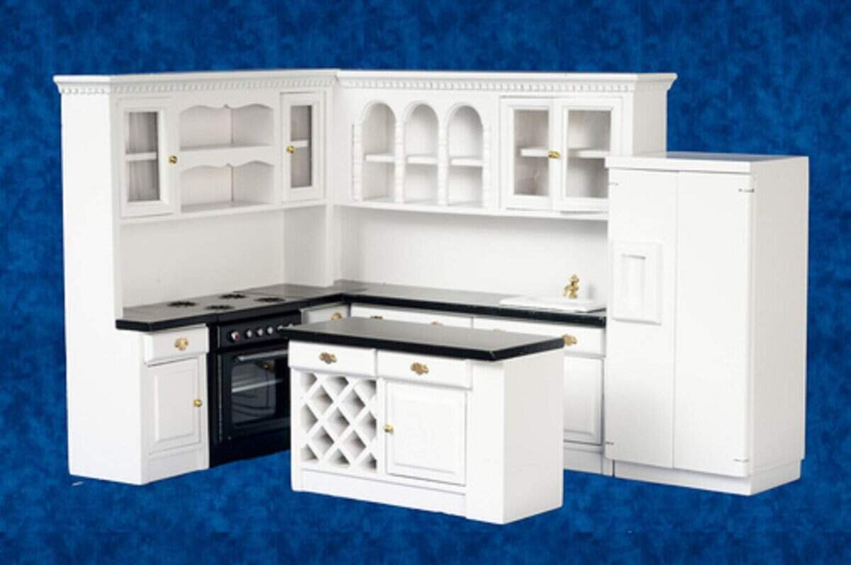 De la colección de miniaturas detalladas de Town Square Miniatures de Aztec Imports. Este conjunto de cocina será una bonita adición a tu escena en miniatura. Muebles de cocina de madera con estufa negra y encimeras de mármol falso negras. Incluye un armario grande con fregadero, unidad de estufa extraíble, nevera e isla. Los cajones y puertas son funcionales. Dimensiones: Armario grande – 7-3/4″ de ancho x 7-1/8″ de alto x 2″ de profundidad. Unidad de estufa – 6-1/2″ de ancho x 7-1/8″ de alto x 2″ de profundidad. Nevera – 2-7/8″ de ancho x 5-1/2″ de alto x 2-1/8″ de profundidad. Isla – 4-1/2″ de largo x 2-7/8″ de alto x 2″ de profundidad. Escala de 1 pulgada a 1 pie. Escala 1:12. Este tamaño es para una casa de muñecas. Detalle modelo a escala para coleccionistas adultos. No apto para menores de 14 años.
