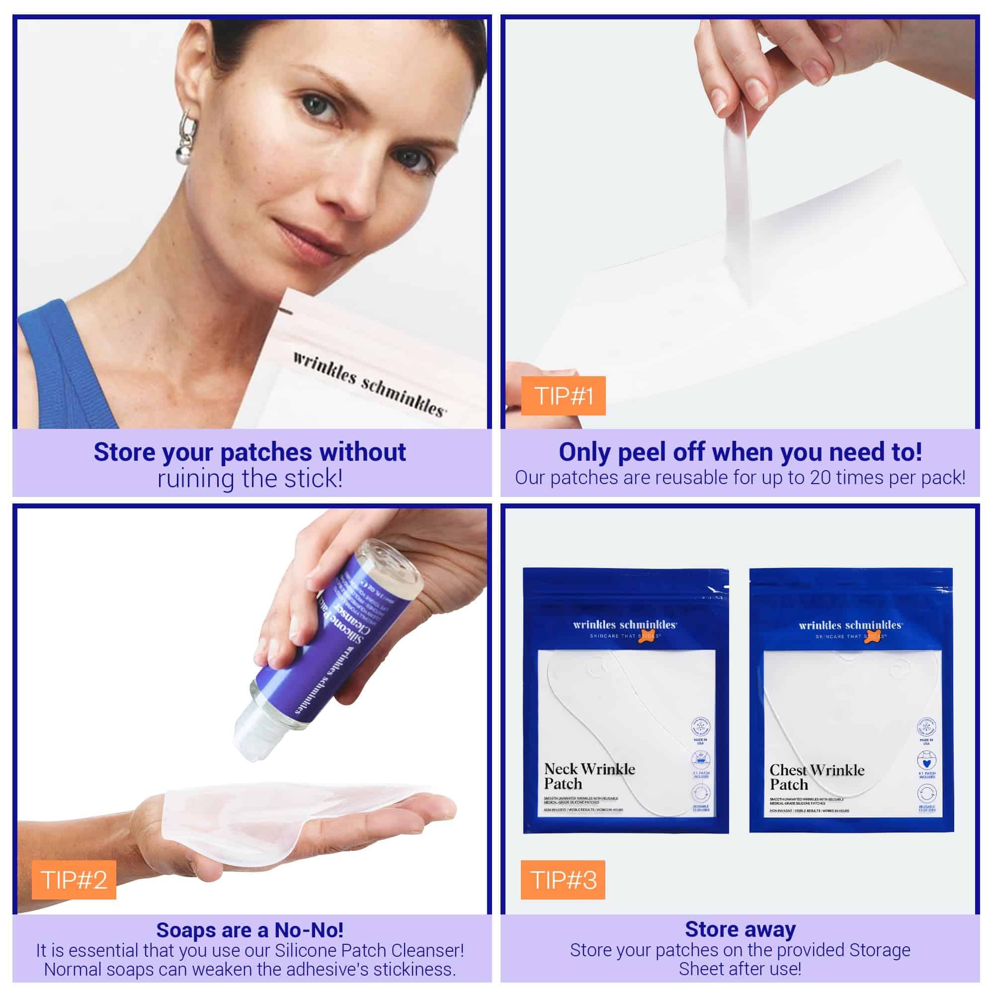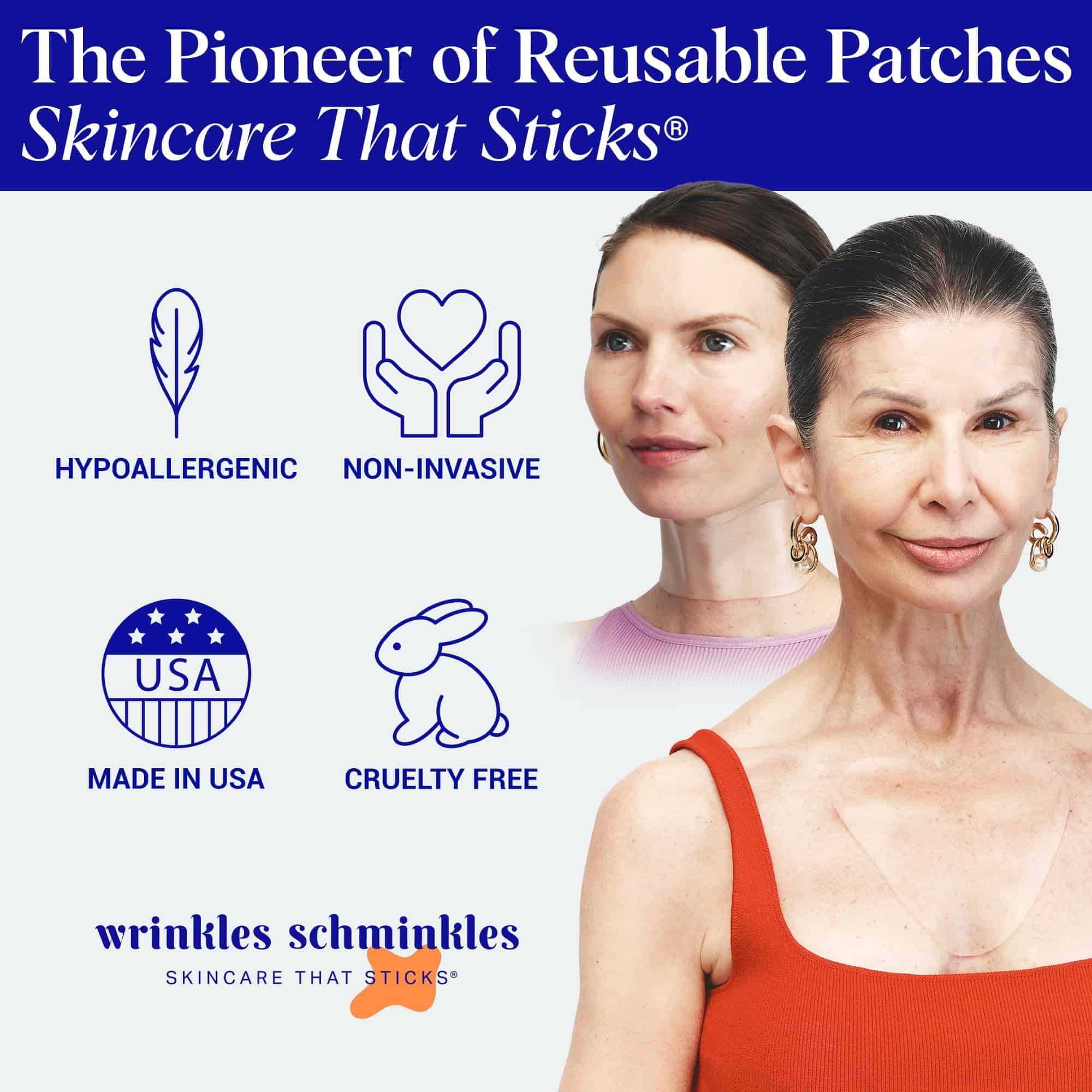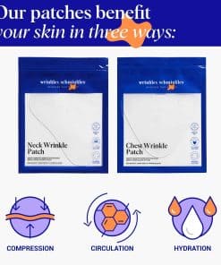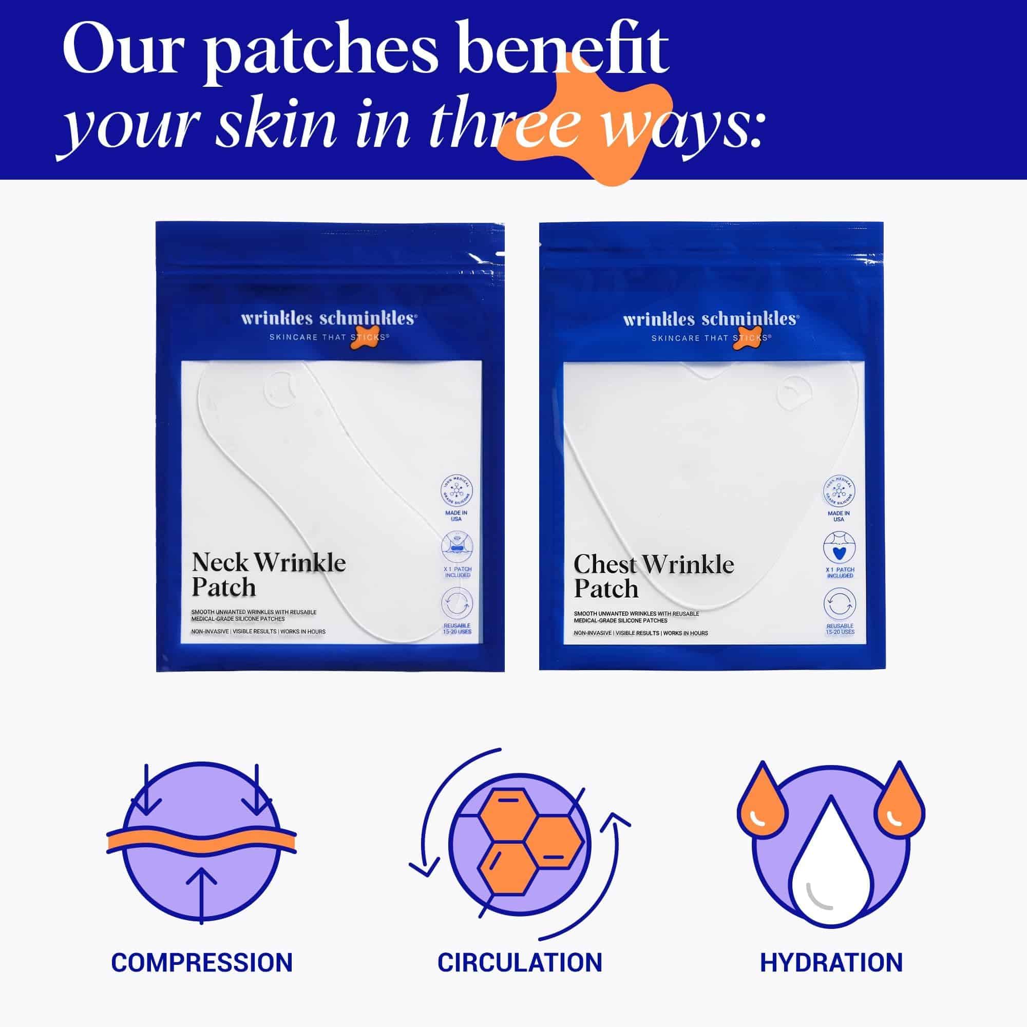 El Conjunto de Parches para el Cuello, Escote y Cuerpo de Wrinkles Schminkles incluye un Parche para el Cuerpo/Cleavage y un Parche para el Cuello. Los Parches suavizan y previenen las arrugas en el Cuello, Escote y Cuerpo al abrazar cómodamente la piel para evitar que se arrugue. Son ideales para prevenir y tratar las arrugas existentes, así como para las marcas de estiramiento en los muslos y brazos. Clínicamente probados para apoyar la capacidad natural de la piel para hidratarla, retener la humedad, estimular el flujo sanguíneo y aumentar la producción de colágeno, una proteína vital que perdemos a medida que envejecemos. ¡Obtén una piel suave y sin arrugas después de tu primer uso, con resultados aún mejores con el tiempo! Recomendados por dermatólogos, los Parches de Wrinkles Schminkles son hipoalergénicos y aptos para pieles sensibles, asegurando que no son tóxicos ni dañinos para tu piel.