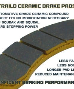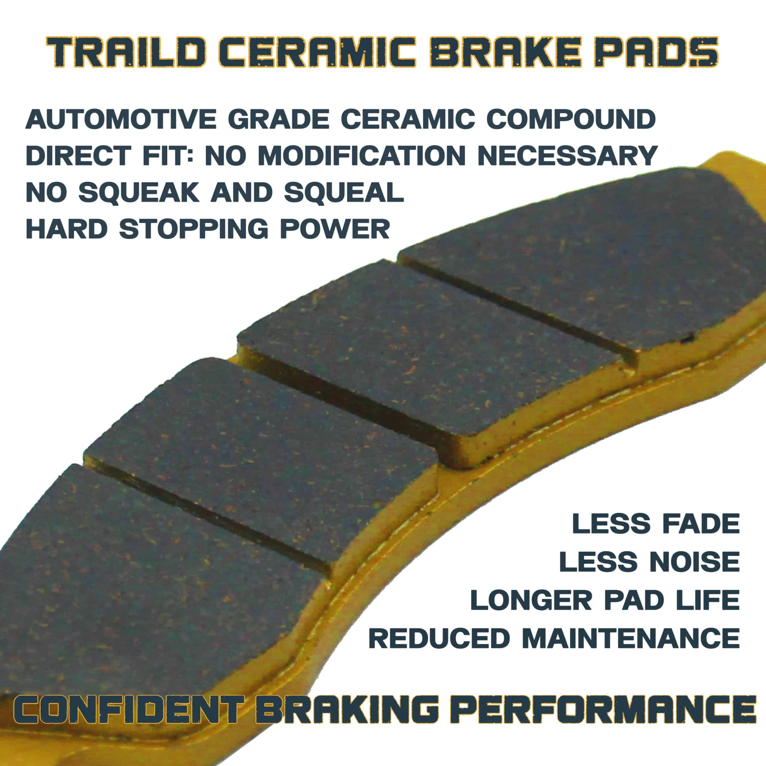 Las pastillas de freno Traild están diseñadas para proporcionar una potencia de frenado superior, durabilidad y confiabilidad tanto para el trabajo como para la conducción en senderos. Las pastillas de freno Traild utilizan un compuesto de cerámica de grado automotriz pionero en la industria en lugar de las tradicionales pastillas de acero sinterizado y ofrecen una serie de beneficios sobre las pastillas de freno metálicas tradicionales, incluyendo: