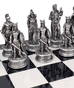 Rey: 3 3/8″, Reina: 3 1/8″, Alfil: 2 7/8″, Caballo: 2 7/8″, Torre: 2 7/8″, Peón: 2 7/8″, Diámetro de la base – 1 1/4″, Peso total de las piezas: – 2 lb 1 oz, Los pesos variarán ligeramente con cada juego, Las piezas vienen en una caja decorativa con almacenamiento de espuma.