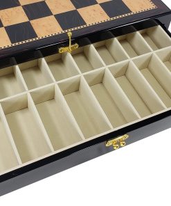 No te pierdas este conjunto de piezas de ajedrez Staunton cromado y negro Pro de Plástico con tablero. Las piezas están doble pesadas y cuentan con bases acolchadas de falso cuero. El tablero presenta un hermoso laminado artificial de alto brillo de color nogal oscuro y arce ojo de pájaro sobre madera mdf. La parte inferior del tablero está completamente fieltada. Tamaño del Tablero: 17 1/4″ x 17 1/4″ x 3 1/2″, Superficie de Juego: 15″ x 15″ con Cuadros de 1 7/8″, Los compartimentos de almacenamiento son de 1 5/8″ x 3 3/4″ en la fila delantera, Los compartimentos de almacenamiento son de 1 5/8″ x 3 5/16″ en la fila trasera, Cada lado tiene su propio cajón. Peso del Tablero: 12 libras (Sin Embalaje). ¡Conjunto de aspecto fantástico!