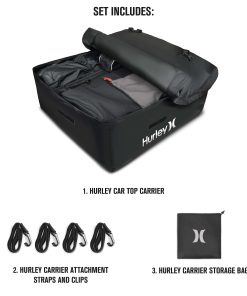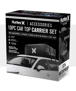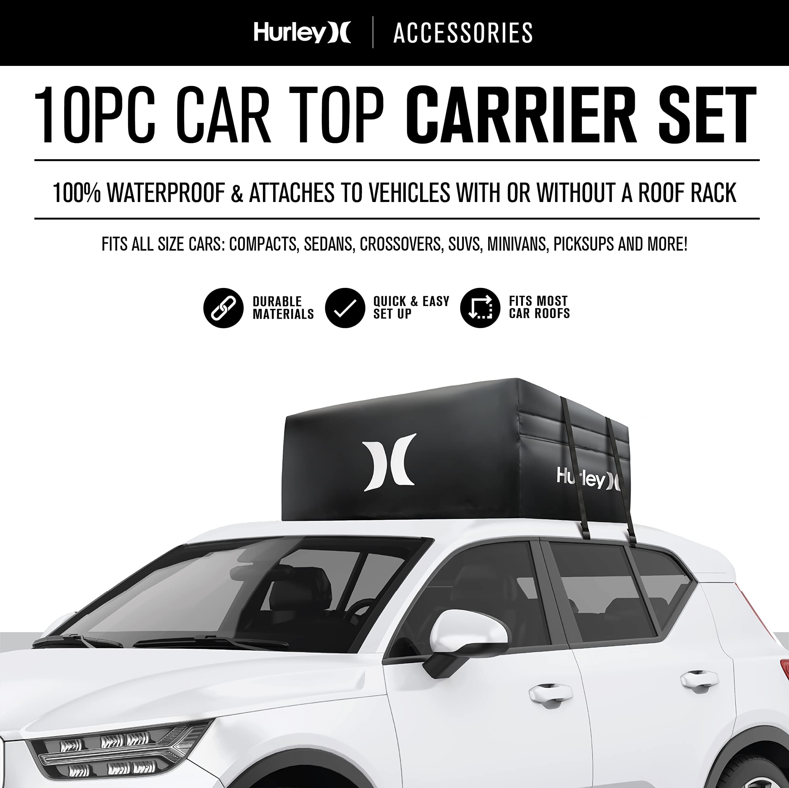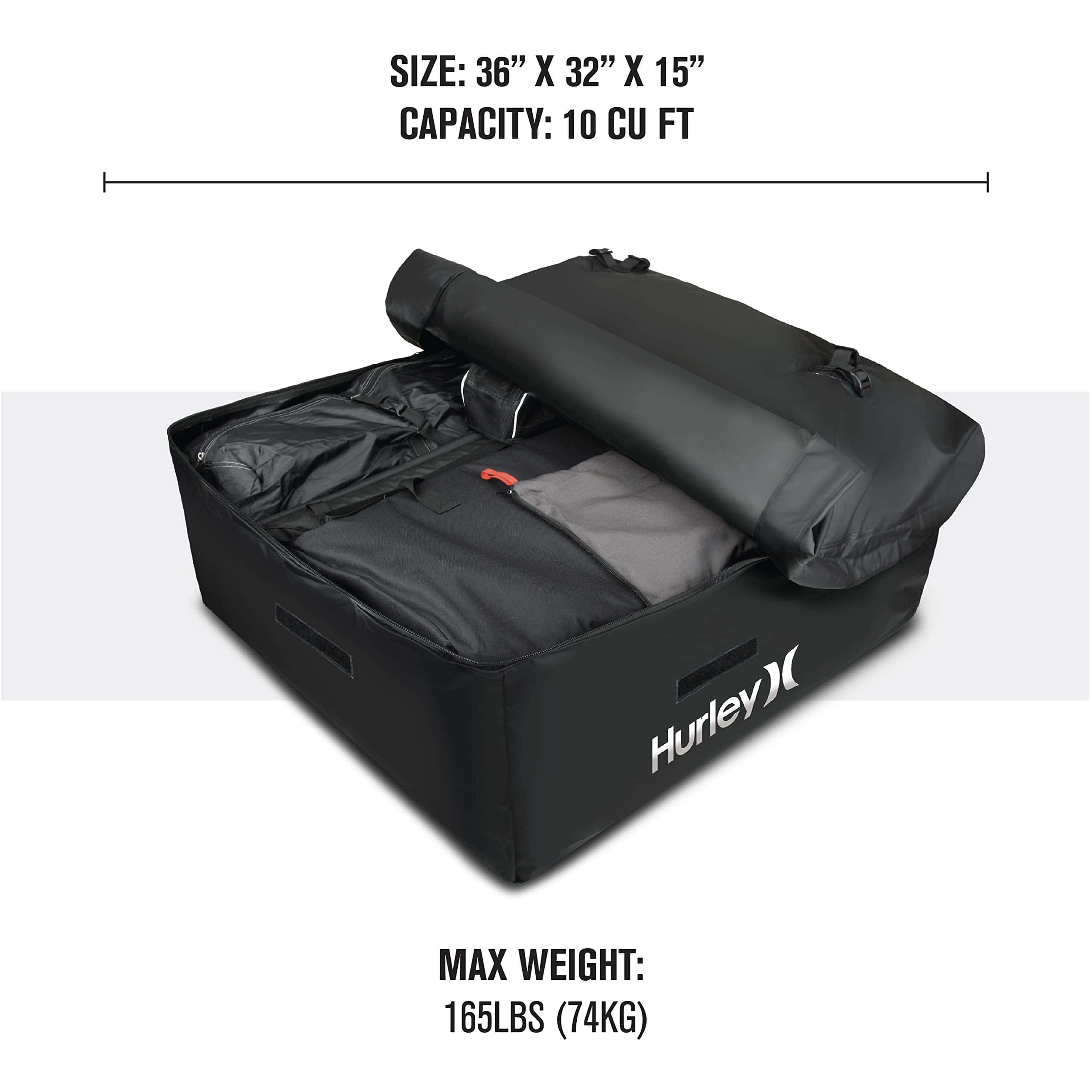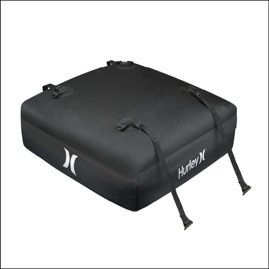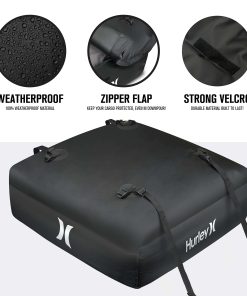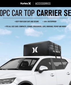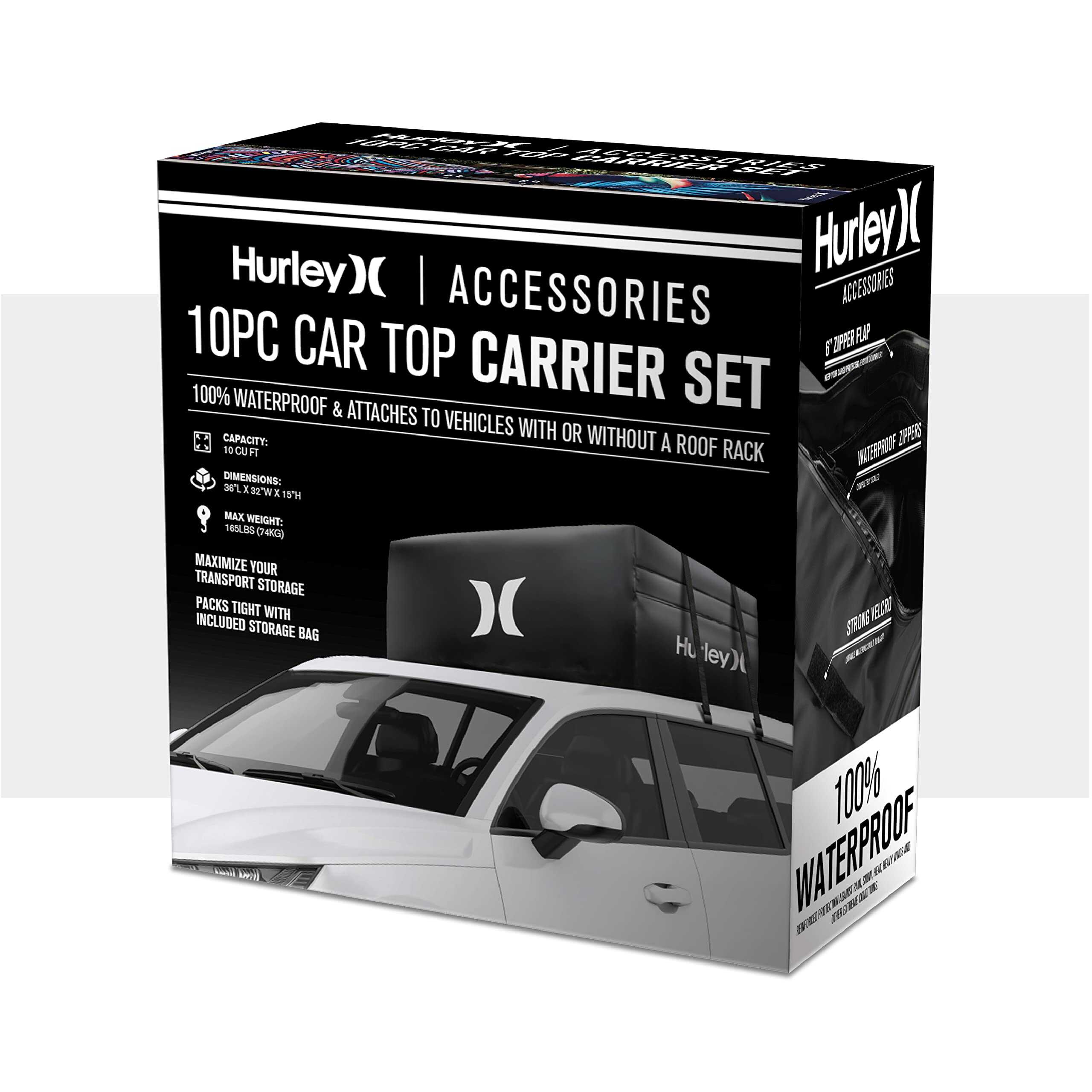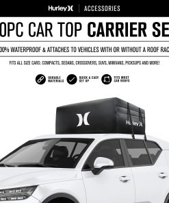 El Conjunto de Portaobjetos para el Techo del Automóvil Hurley es de alta capacidad y puede contener una gran cantidad de equipo, ropa o cualquier artículo que desee empacar. Se adapta a todos los tamaños de automóviles: compactos, sedanes, crossovers, SUVs, minivans, pickups y más. Seguro y seguro, se ajusta firmemente al techo del automóvil y puede funcionar con o sin barras transversales de rack de techo. 100% Impermeable: Protección reforzada contra la lluvia, la nieve, el calor, los vientos fuertes y otras condiciones extremas. Resiste los elementos externos y las duras condiciones de tormenta con material de lona resistente y cremalleras impermeables. Dimensiones: 36 L x 32 W x 15 H (Capacidad: 10 pies cúbicos, Peso máximo: 165 libras).