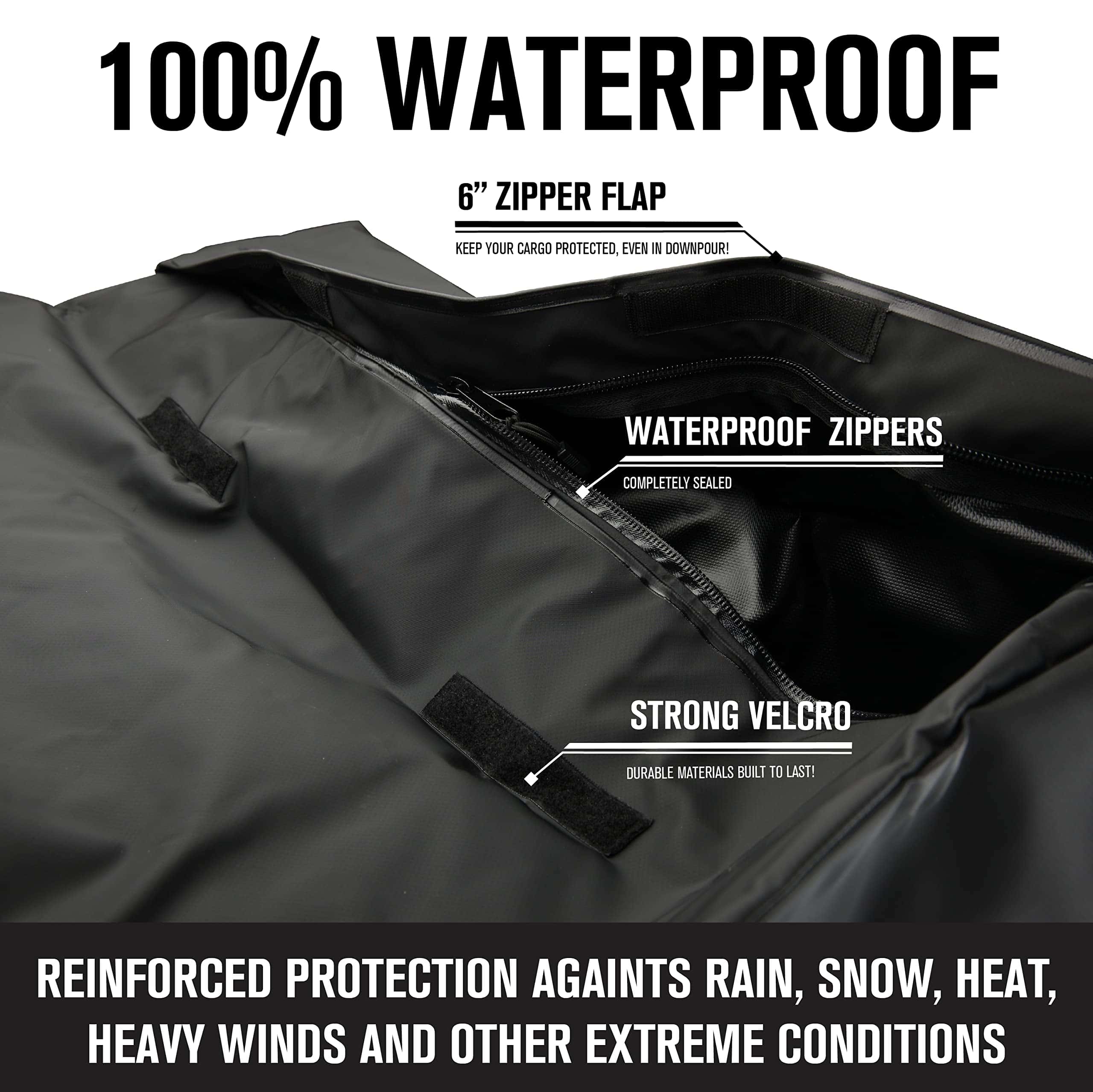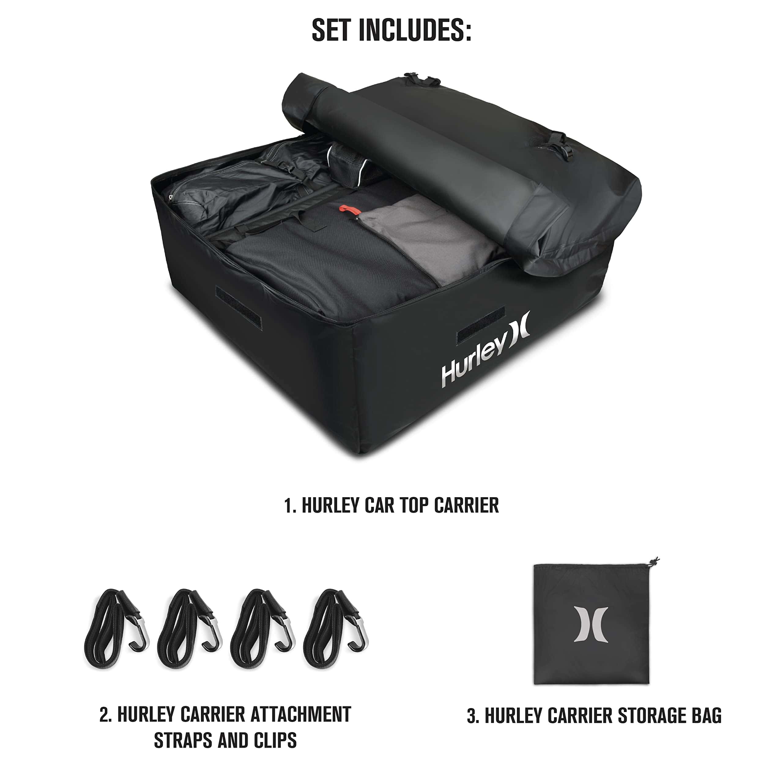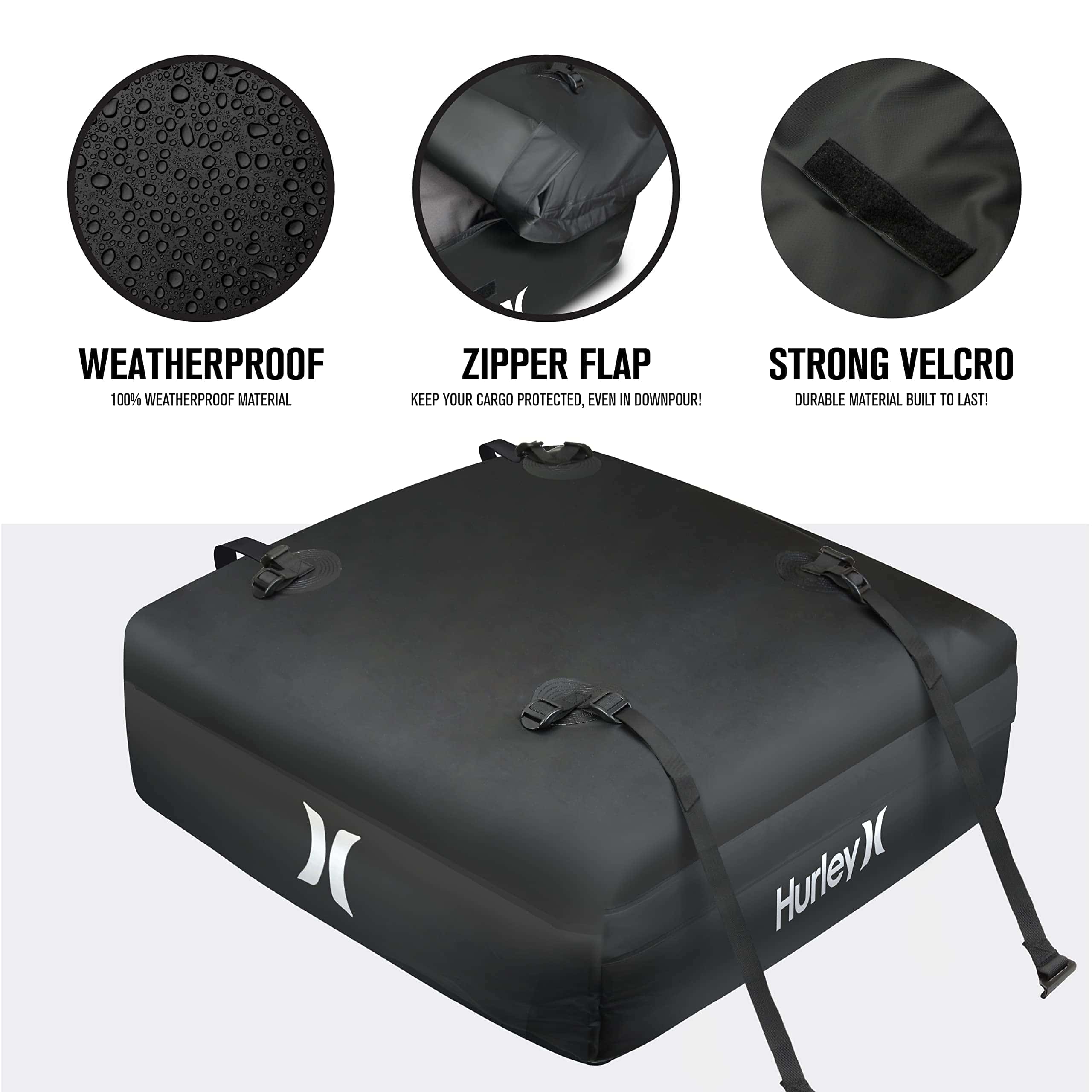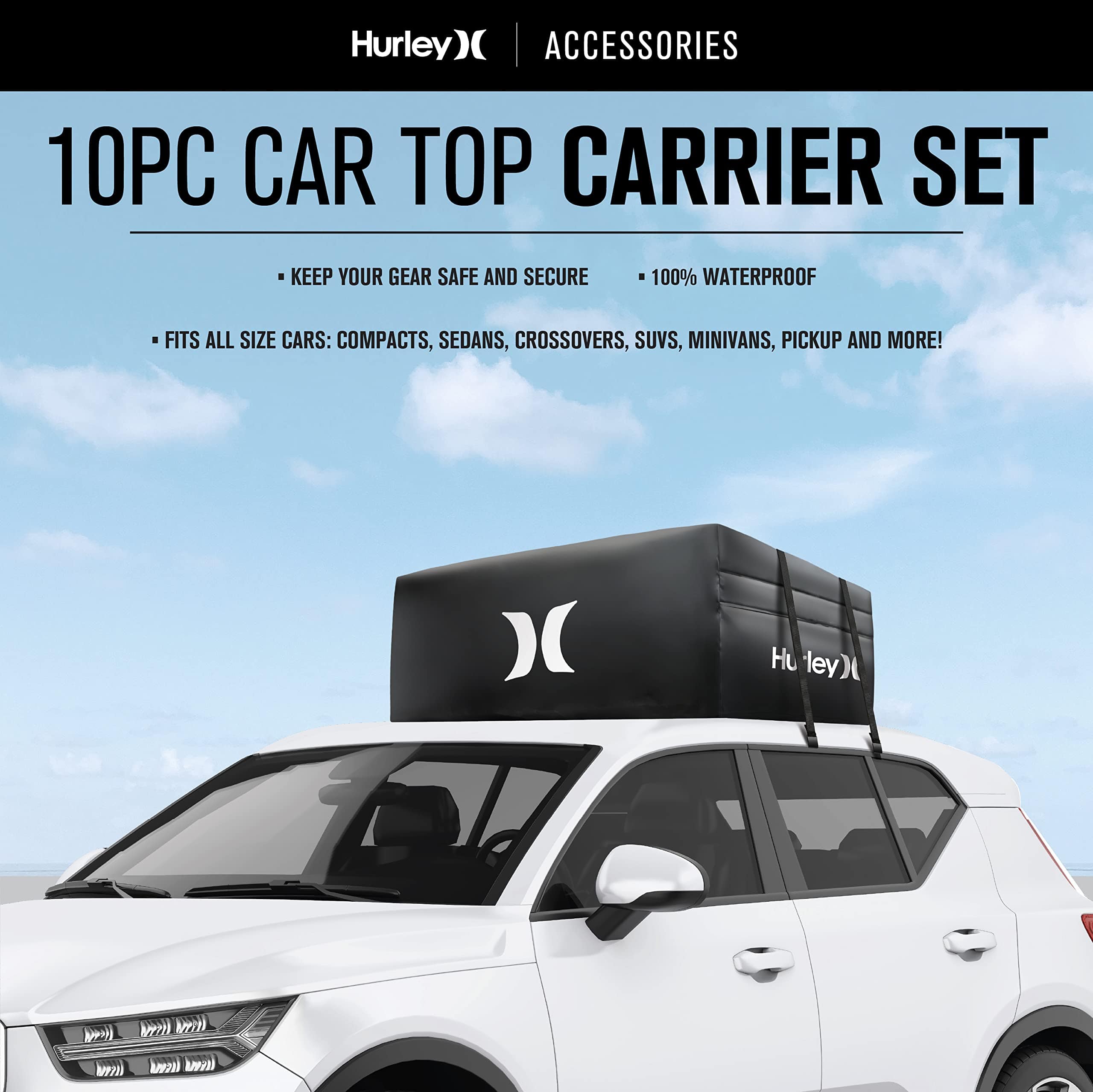 El Conjunto de Portaobjetos para el Techo del Automóvil Hurley es de alta capacidad y puede contener una gran cantidad de equipo, ropa o cualquier artículo que desee empacar. Se adapta a todos los tamaños de automóviles: compactos, sedanes, crossovers, SUVs, minivans, pickups y más. Seguro y seguro, se ajusta firmemente al techo del automóvil y puede funcionar con o sin barras transversales de rack de techo. 100% Impermeable: Protección reforzada contra la lluvia, la nieve, el calor, los vientos fuertes y otras condiciones extremas. Resiste los elementos externos y las duras condiciones de tormenta con material de lona resistente y cremalleras impermeables. Dimensiones: 36 L x 32 W x 15 H (Capacidad: 10 pies cúbicos, Peso máximo: 165 libras).
