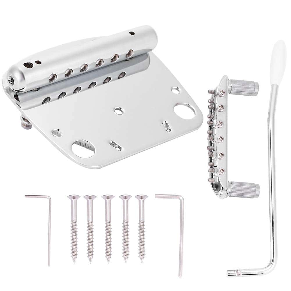 PUENTE PLATEADO: El puente de cola está plateado de manera uniforme y la superficie se ve hermosa. Viene con llaves, la altura del puente y la montura se pueden ajustar. PAQUETE INCLUYE: 1 Puente de Cola; 1 Puente; 1 Brazo de Trémolo; 2 Llaves; 5 Tornillo. MATERIALES DE ALTA CALIDAD: Hecho de aleación de cobre zinc plateado de alta calidad y acero, resistente y duradero. GRAN ACCESORIO: Sistema de vibrato para Mustang, para reparar guitarras antiguas y reemplazar puentes antiguos.