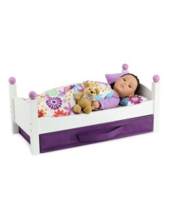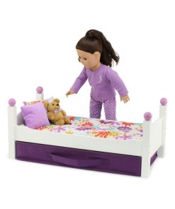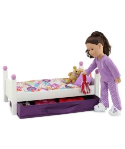 Cama blanca clásica para muñecas individuales, combinada con ropa de cama de colores para muñecas, incluyendo edredón, almohada para dormir e incluso una divertida almohada decorativa. También se incluye un cómodo colchón blanco. El marco blanco simple permite que se combine con cualquiera de nuestras otras piezas de muebles para muñecas. Busca el código de producto INS1083 para nuestro juego de literas apilables Emily Rose a juego. Las dimensiones a continuación se basan en el producto completamente ensamblado. Muñeca no incluida
