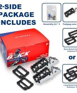 Extendible para un Mejor Control: Los reposapiés PIVOTRAX de la Serie Brick te permiten aumentar la superficie del reposapiés para brindar un mejor control en diferentes entornos de conducción. Además, con piezas extensibles de cambio rápido, podrás adaptarte rápidamente a las condiciones del terreno. Personalización y Estilo: La Serie Brick ofrece una amplia gama de diseños de garras y opciones de color que te permiten personalizar tu motocicleta con estilo y elegancia. Asimismo, la posibilidad de reemplazar partes individuales desgastadas sin cambiar todo el ensamblaje te ayuda a mantener la estética de tu vehículo mientras ahorras dinero. Comodidad y Flexibilidad: Con las posiciones de ángulo ajustables, puedes encontrar la posición perfecta para tus pies, proporcionando una conducción cómoda y personalizada. Pruebas de Durabilidad: La Serie Brick se somete a pruebas rigurosas de durabilidad, incluidas las pruebas destructivas y de vibración realizadas por ARTC, para garantizar un rendimiento confiable y duradero en todas tus aventuras en motocicleta.