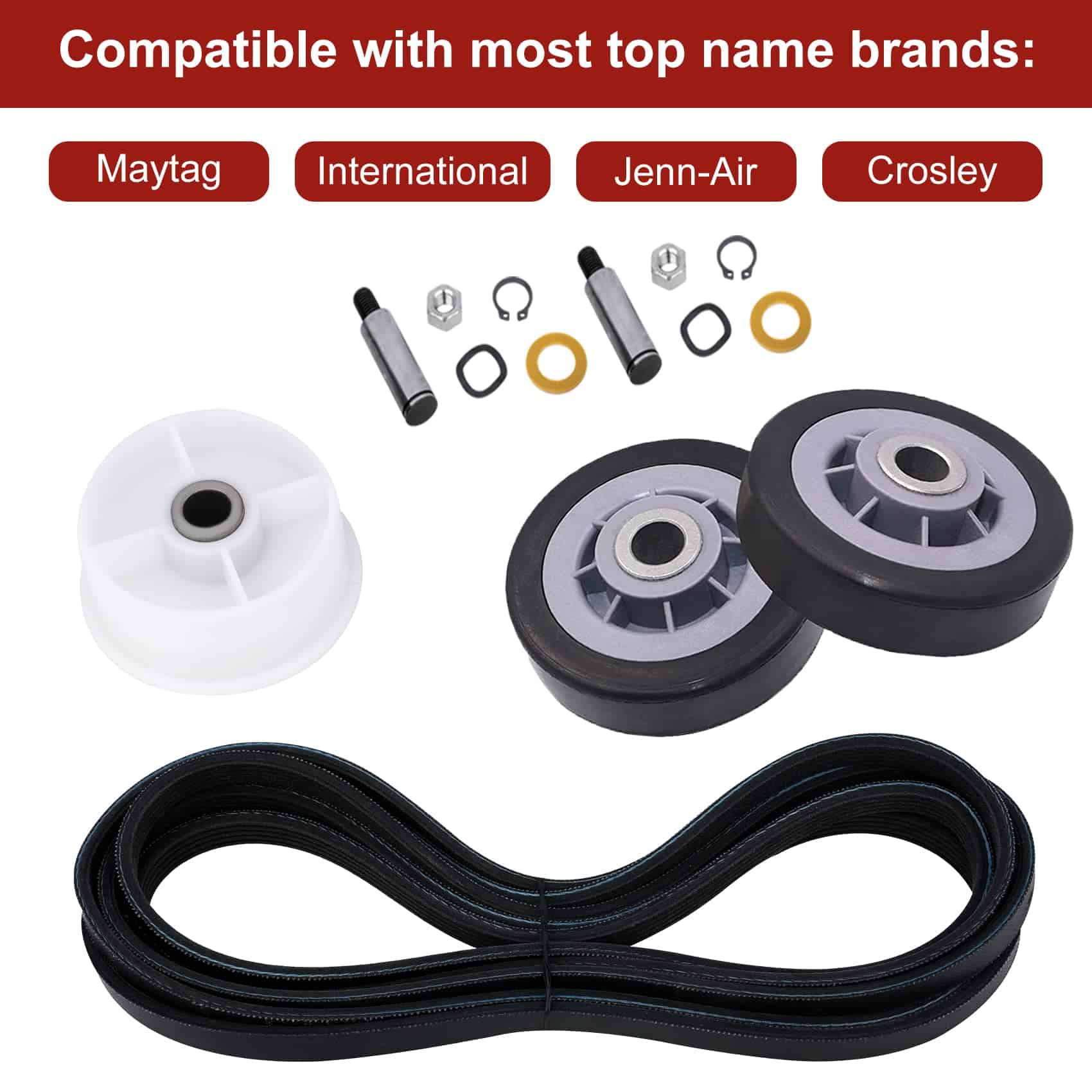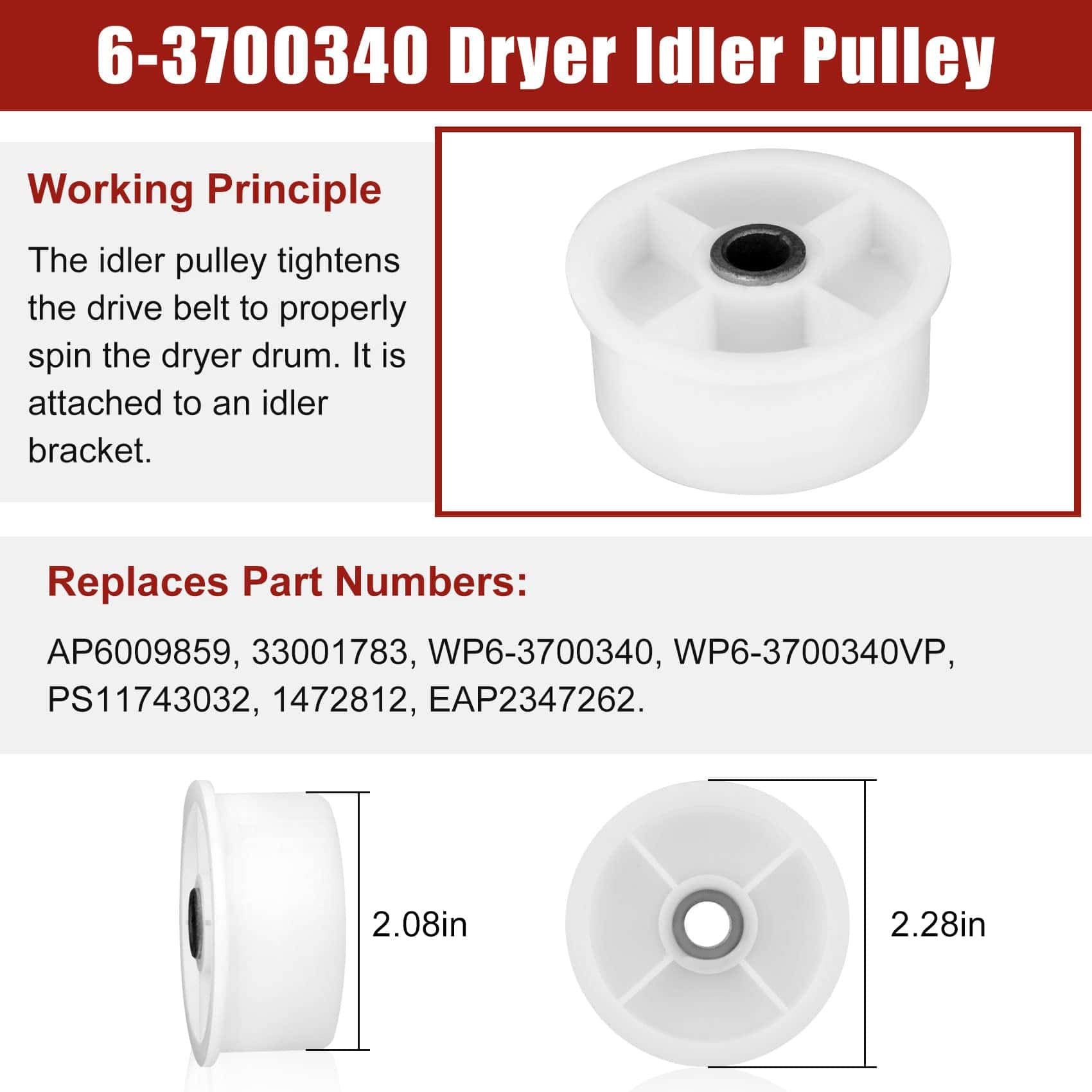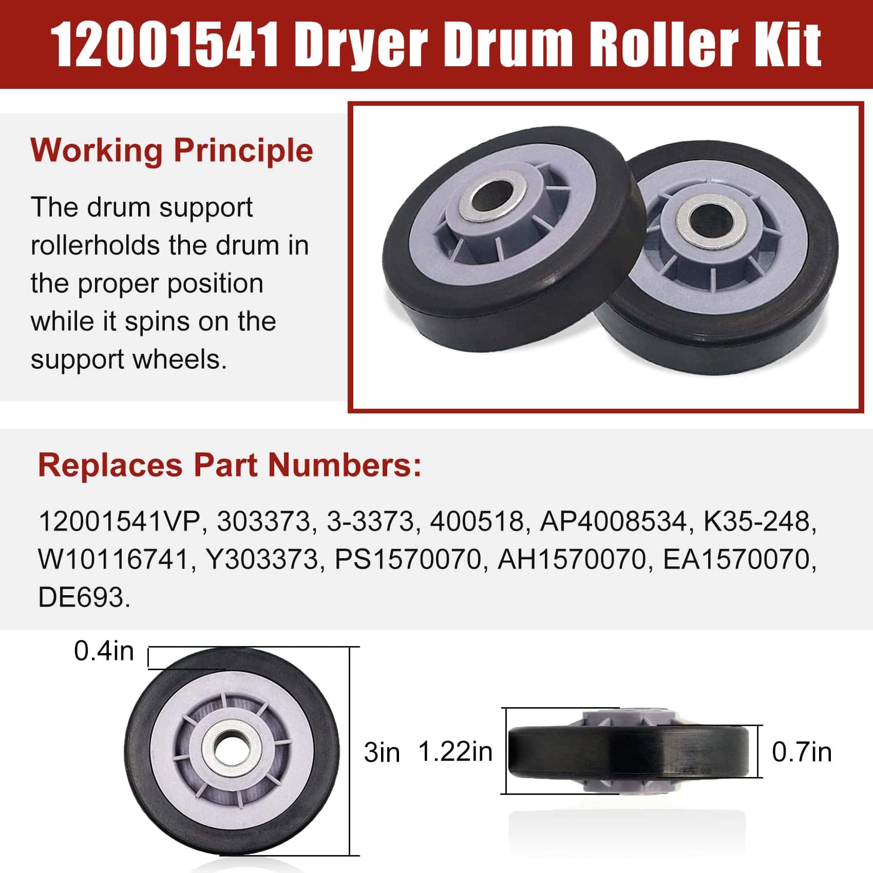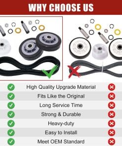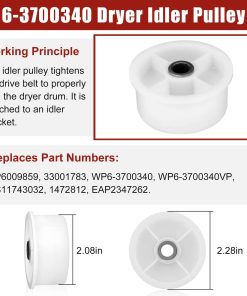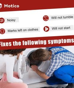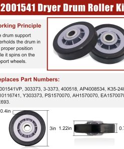 Paquete incluido: 2 x soportes de tambor, 2 x ejes, 2 x arandelas de fibra, 2 x tuercas, 2 x clips C, 2 x arandelas de resorte. Síntomas a solucionar: 1. Ruidoso 2. No gira 3. Deja manchas en la ropa 4. No enciende. Números de pieza de repuesto: 12001541 Rodillo del Tambor de Secadora Piezas de Repuesto 12001541VP, AP4008534, PS1570070, EAP1570070, W10116741, 3-3373, 303373, 303373K, Y303373, DE693, K35-248,400518,etc.; Polea Tensora WP6-3700340 Piezas de Repuesto 33001783,6-3700340,wp6-3700340vp, 1472812, ap4373393, ps2347262, eap2347262, etc. Correa del Tambor WP33002535 Piezas de Repuesto 33001777330253, five wp33002535vp, 791135, ap6007983, ps11741110, eap11741110, etc Marcas y Modelos Compatibles: (NOTA: Por favor, use la tecla de acceso directo «Ctrl+F» para buscar el modelo que necesita en esta página. Si no lo encuentra, por favor envíenos un correo electrónico.)