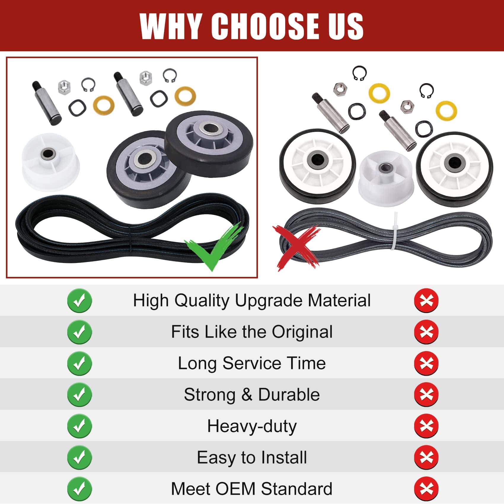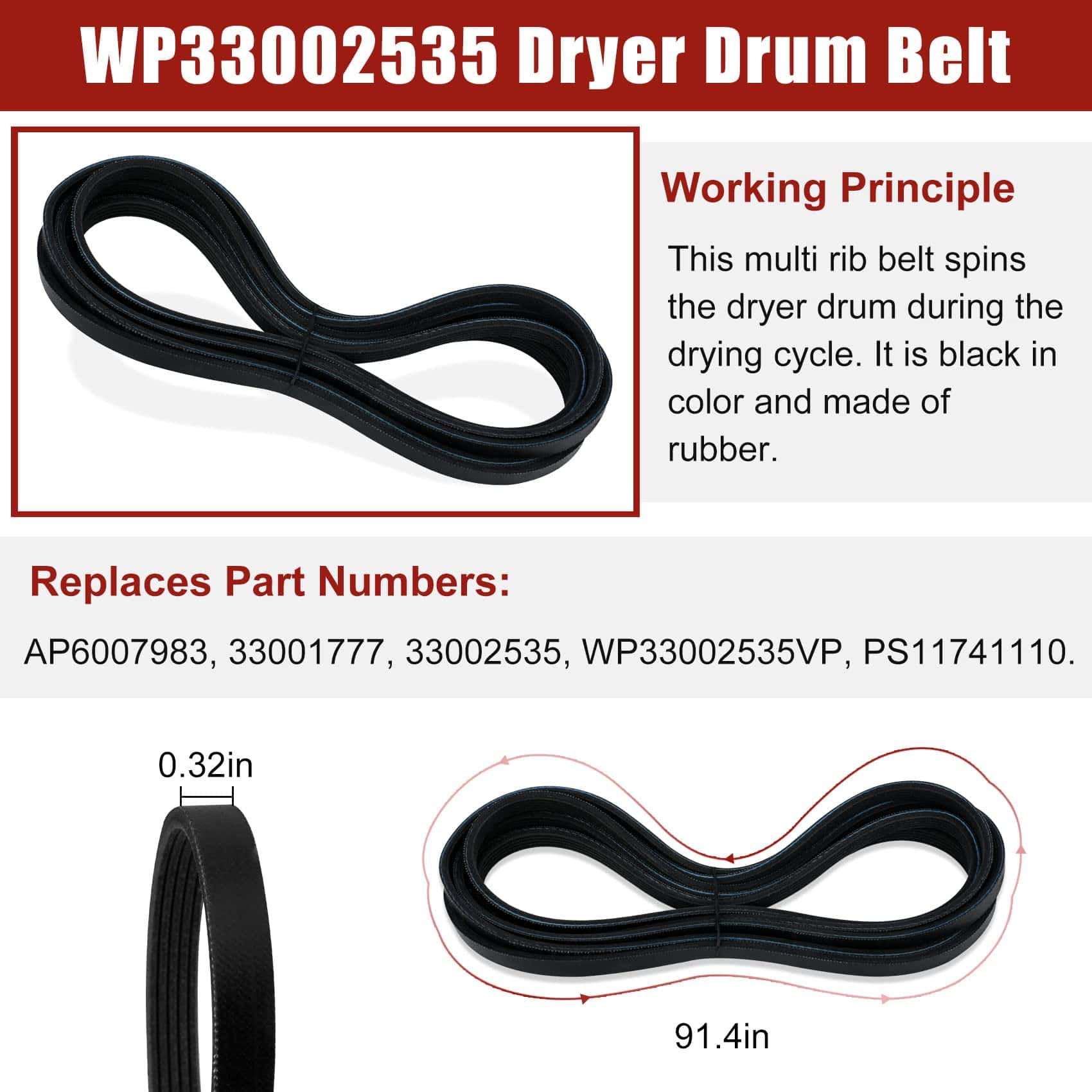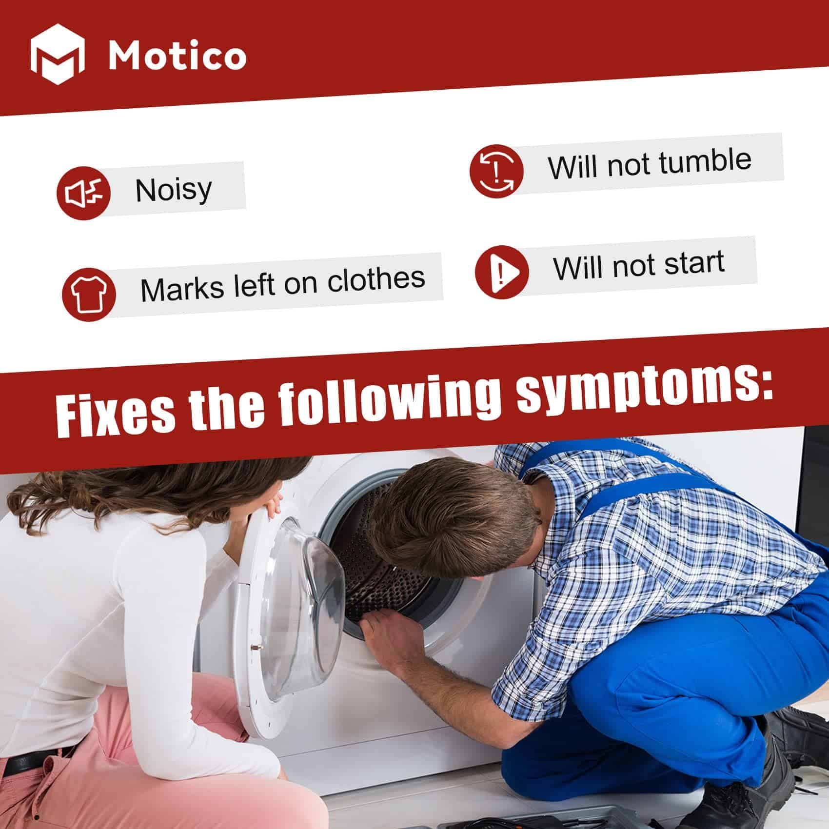 Paquete incluido: 2 x soportes de tambor, 2 x ejes, 2 x arandelas de fibra, 2 x tuercas, 2 x clips C, 2 x arandelas de resorte. Síntomas a solucionar: 1. Ruidoso 2. No gira 3. Deja manchas en la ropa 4. No enciende. Números de pieza de repuesto: 12001541 Rodillo del Tambor de Secadora Piezas de Repuesto 12001541VP, AP4008534, PS1570070, EAP1570070, W10116741, 3-3373, 303373, 303373K, Y303373, DE693, K35-248,400518,etc.; Polea Tensora WP6-3700340 Piezas de Repuesto 33001783,6-3700340,wp6-3700340vp, 1472812, ap4373393, ps2347262, eap2347262, etc. Correa del Tambor WP33002535 Piezas de Repuesto 33001777330253, five wp33002535vp, 791135, ap6007983, ps11741110, eap11741110, etc Marcas y Modelos Compatibles: (NOTA: Por favor, use la tecla de acceso directo «Ctrl+F» para buscar el modelo que necesita en esta página. Si no lo encuentra, por favor envíenos un correo electrónico.)