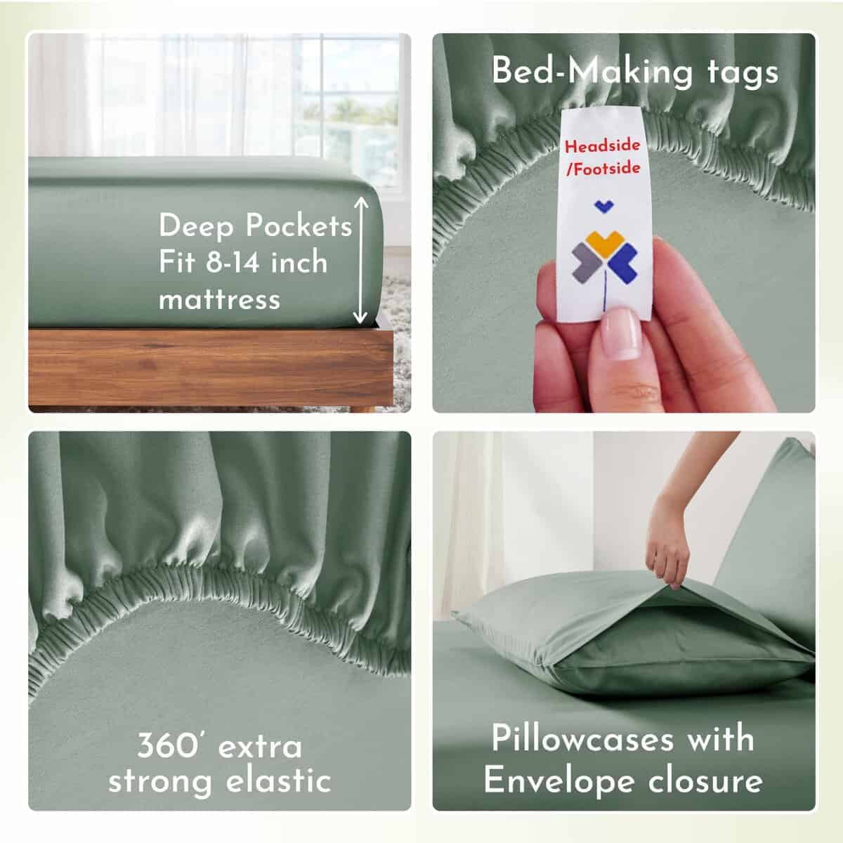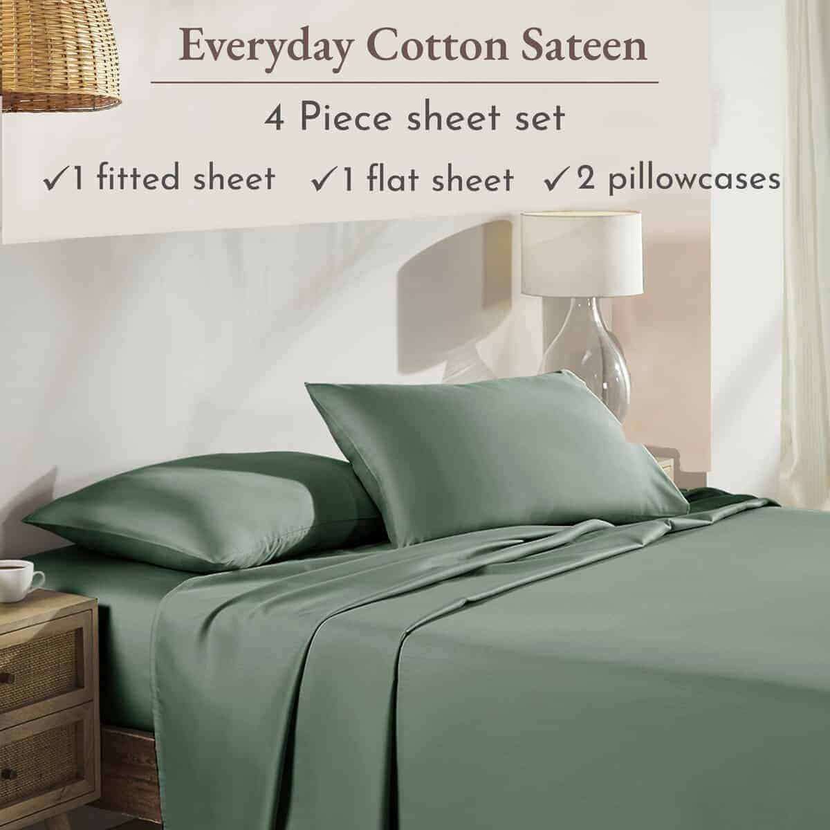 Conjunto de sábanas de cama King de 4 piezas hechas de algodón sateen 100% naturalmente cómodo. Estas suaves y transpirables sábanas y fundas de almohada de enfriamiento están diseñadas para brindar comodidad duradera durante todo el año. Nuestras sábanas de tamaño king no son juego de sábanas sintéticas o de poliéster mezclado. Estas sábanas king size están hechas con el mejor algodón cultivado en la India y todo nuestro ropa de cama de algodón y fundas de almohada son amadas por los clientes por su calidad superior, suavidad y comodidad. En este juego de sábanas verdes King de 4 piezas se incluye 1 sábana plana superior, 1 sábana ajustable inferior con bolsillo profundo de 14 pulgadas y 2 fundas de almohada tamaño king. Las fundas de almohada con cierre de sobre aseguran un aspecto ordenado. Nuestra sábana ajustable inferior tiene un elástico ajustable y un "indicador de cabeza/pie" para una experiencia fácil al hacer la cama. Cuidado y soporte para lavado: Estas sábanas de cama de algodón tamaño king son fáciles de lavar y secar a máquina y se suavizan con cada lavado. Han sido probados para la contracción, el agrupamiento y la solidez del color. Compre sin riesgos, ya que puede devolver este juego de sábanas de algodón si no le gustan, incluso si están lavadas. Lo que nos hace confiables: Nuestra colección de ropa de cama está certificada por OEKO-TEX STANDARD 100 para garantizar que no entren sustancias dañinas en su cama. Utilizamos cajas sin plástico para nuestro embalaje y estamos comprometidos con procesos conscientes y éticos.