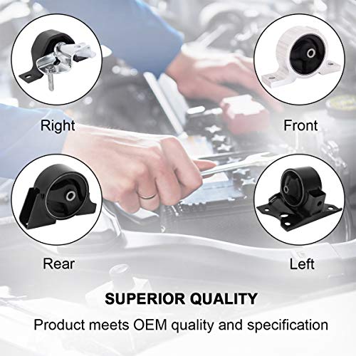 La función principal del conjunto de soportes de motor es mantener el motor y la transmisión asegurados al chasis del vehículo y prevenir daños causados por impacto en algunos componentes. Pero a veces, el soporte se desgasta, se rompe o se afloja. Cuando falla, el motor y la transmisión pueden moverse excesivamente, los componentes pueden dañarse y se creará cierto ruido anormal. El viaje completo se volverá incómodo y también existen riesgos al conducir. Si el soporte del motor falla, es hora de hacer un reemplazo. Nuestro soporte de motor está construido bajo altos estándares y superará tus demandas e imaginación. (1) CALIDAD OEM: El producto cumple con la calidad y especificaciones OEM, diseñado por software de escaneo 3D. (2) ESPECIALIDAD: La goma natural se somete a pruebas de resistencia a la tensión, medidas por un reómetro que sigue las propiedades viscoelásticas internacionales. (3) COMODIDAD: Todo el material de goma se fabrica en Malasia, coincidiendo con OE asegurando la máxima comodidad del ocupante mediante la transferencia de la frecuencia de vibración en todo el motor. (4) SEGURIDAD: La goma y el metal están unidos por un recubrimiento de adhesivo de chemlok especial, proporcionando una excelente resistencia a la abrasión y durabilidad en las condiciones más extremas, incluyendo vibración, calor de escape y solventes. (5) QC: El producto terminado pasa por la tecnología de soldadura robotizada y un doble procedimiento de control de calidad. El paquete incluye: EM9200 / A7314 – Soporte frontal de motor EM9229 / A4305 – Soporte frontal derecho de motor EM9166 / A7315 – Soporte trasero de motor EM9217 / A4301 – Soporte de transmisión Compatibilidad: (1) Año: 2000, 2001, 2002, 2003, 2004, 2005, 2006/2000, 2001 (2) Marca y Modelo: Compatible con Sentra (3) Recorte: XE Sedan 4 puertas/XE SE Sedan 4 puertas/XE SE Edicion Especial Sedan 4 puertas/S Sedan 4 puertas/LE Sedan 4 puertas/GXE Sport Sedan 4 puertas/GXE Sedan 4 puertas (4) Motor: 1.8L Auto/2.0L Auto