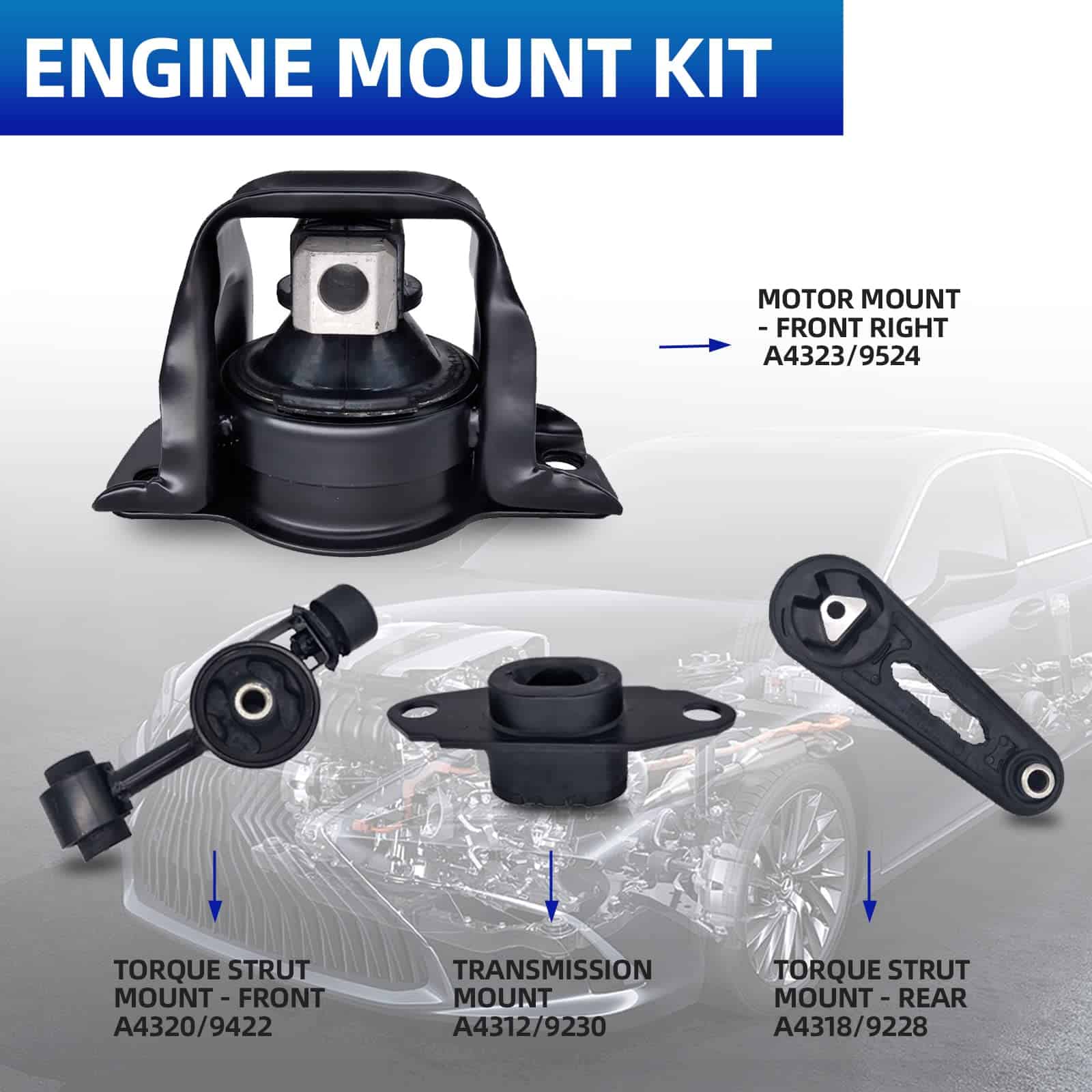 Acero y goma de alta calidad garantizan un viaje suave y silencioso. Incluye (juego de 4 piezas) A4312: Soporte de transmisión izquierdo. A4318: Soporte de torque del motor trasero o trasero izquierdo. A4320: Soporte de torque del motor derecho. A4323: Soporte de motor delantero o delantero derecho. Compatible con Nissan Cube 2009 2010 2011 2012 2013 2014 1.8L y Nissan Versa 2007 2008 2009 2010 2011 2012 1.8L.