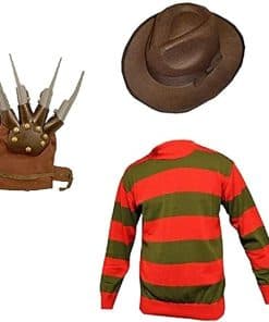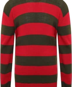 Conjunto de tres piezas a rayas incluye suéter a rayas rojas y verdes, sombrero y guantes. Perfecto para disfraz de Halloween o uso casual. Material de alta calidad y ligero.