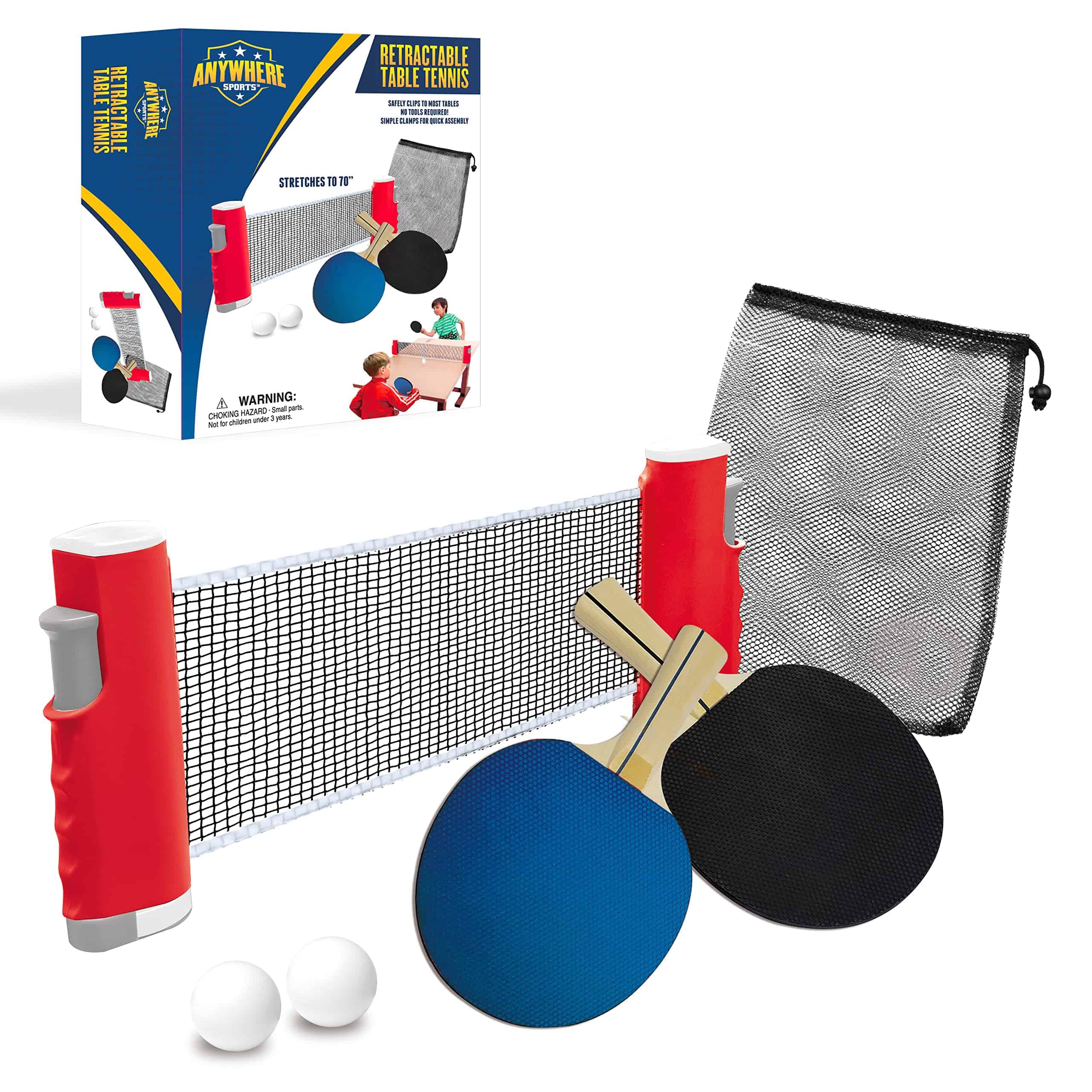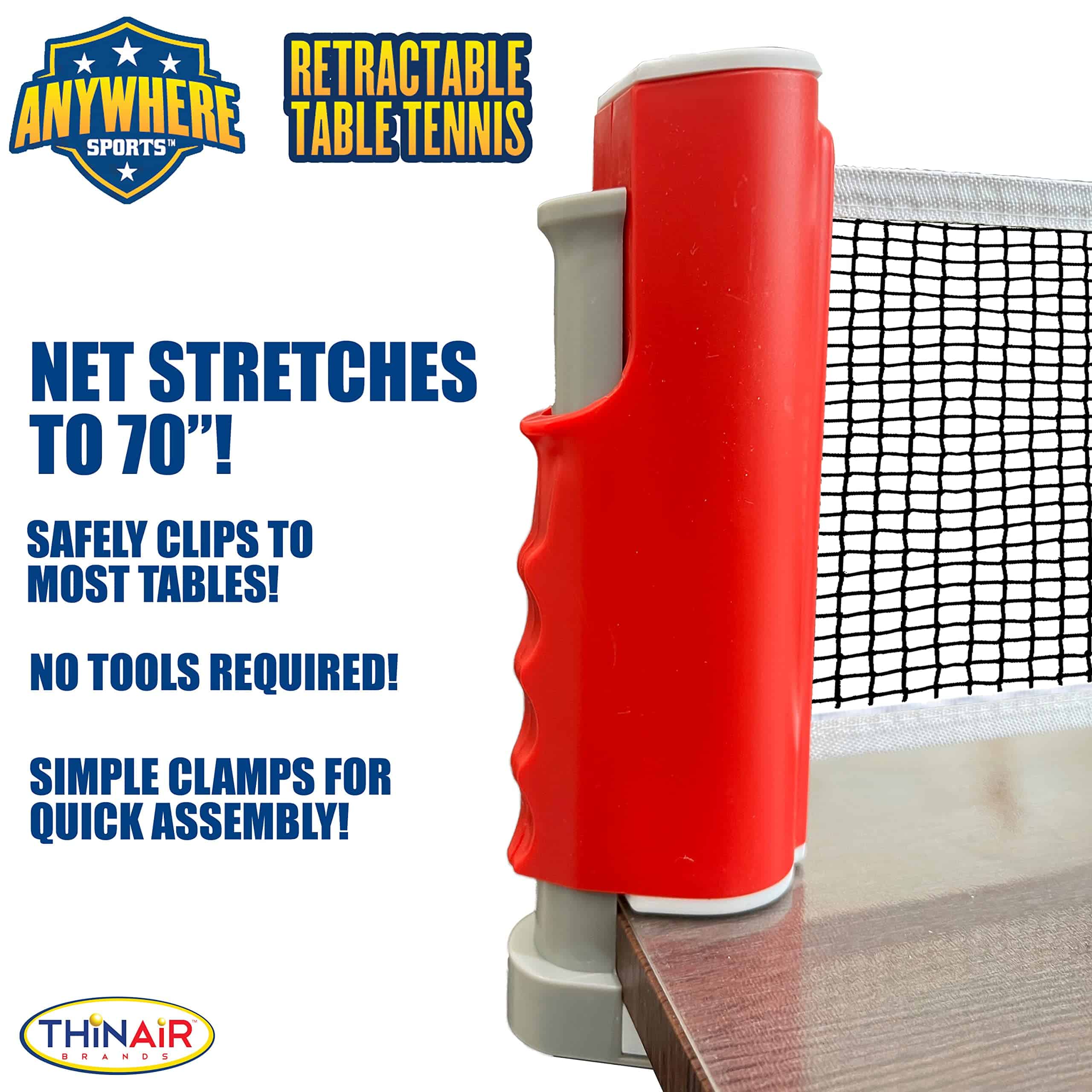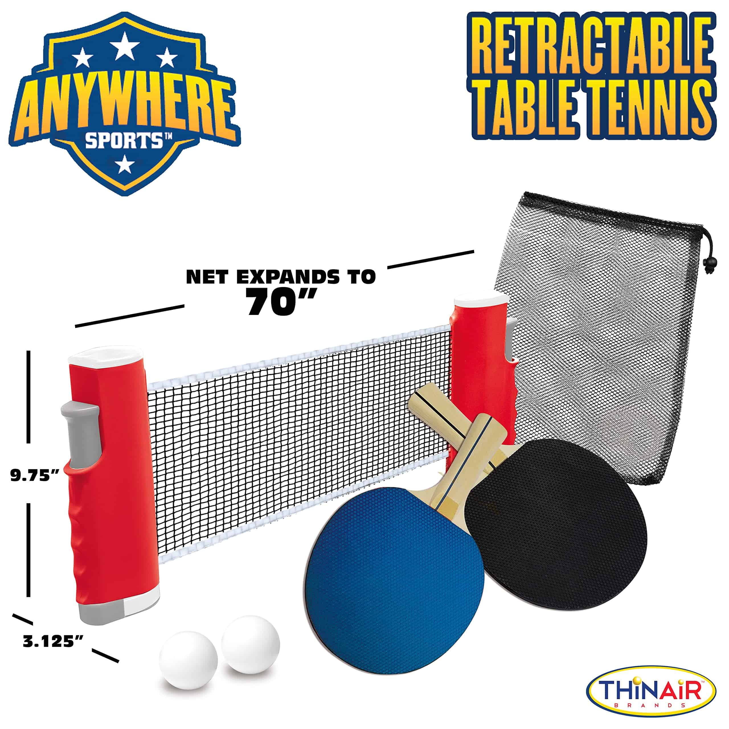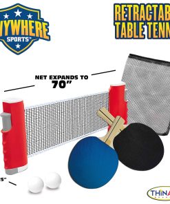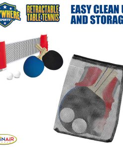 DEPORTES EN CUALQUIER LUGAR: TENIS DE MESA RETRÁCTIL – Transforma cualquier mesa en un campo de batalla emocionante con nuestro «Conjunto de Tenis de Mesa Retractil» de Thin Air Brands. Este set fácil de instalar está diseñado para brindar la máxima diversión y comodidad, para que puedas llevar tu pasión por el ping pong a dondequiera que vayas. La innovadora red retractil de ping pong es revolucionaria, extendiéndose hasta 70 pulgadas para adaptarse a cualquier mesa. Fácil de configurar y desmontar, puedes convertir tu mesa de comedor, escritorio de oficina o incluso tu mesa de picnic en una emocionante arena en cuestión de segundos. Está diseñado con un sistema de clip de resorte avanzado que fija la red de forma segura a cualquier superficie mientras garantiza facilitar la extracción. Nuestro kit no se detiene en la red. Incluye dos paletas de grado profesional, creadas para un rendimiento y durabilidad superiores. Los mangos ergonómicos y la superficie de goma de alto rebote te aseguran una ventaja ganadora en cada partido. También proporcionamos dos pelotas premium con el rebote perfecto para mantener afilado y entretenido tu juego. El almacenamiento es pan comido con nuestra bolsa de transporte de malla incluida. El diseño compacto y ligero te permite guardar convenientemente todos los componentes después de cada partido, lo que lo hace ideal para viajar o para almacenar en casa sin ocupar espacio extra. Con el Conjunto de Tenis de Mesa Retractil de Thin Air Brands, no necesitas una mesa profesional para disfrutar de un partido profesional. Es un regalo ideal para principiantes, jugadores experimentados o cualquier persona que busque agregar un poco de diversión a su rutina diaria. Entonces, ¿por qué esperar? Libera a tu campeón interior y redefine el juego con este set versátil.