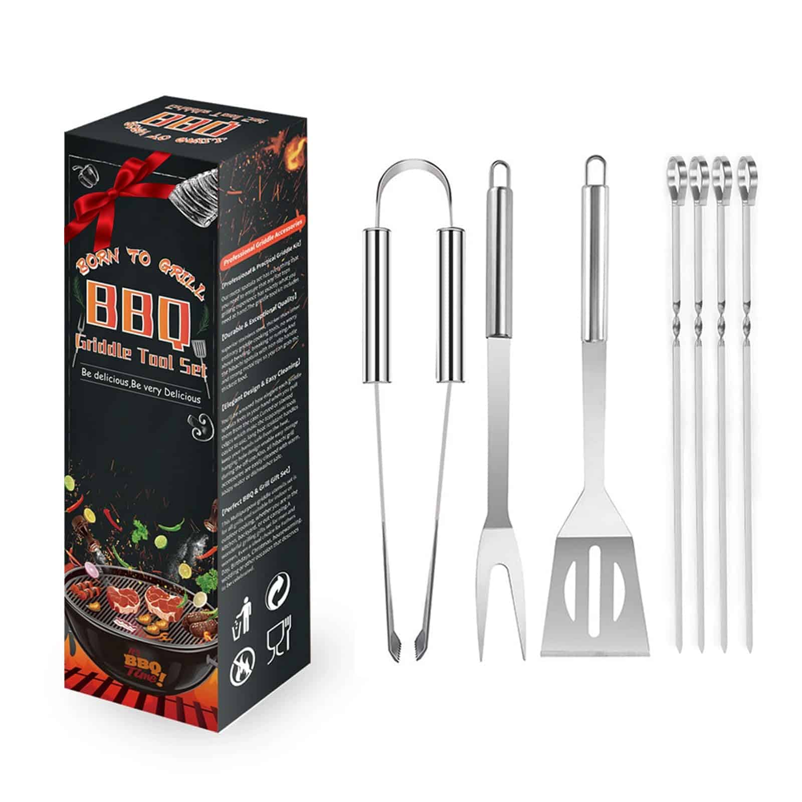 Este set de herramientas de barbacoa de alta calidad y seguro está hecho de acero inoxidable 304, que es resistente al calor, resistente al desgaste y seguro para lavavajillas. Después de una selección cuidadosa, estas 7 piezas de utensilios de parrilla son muy prácticas. Los accesorios de parrilla incluidos son los más utilizados en las barbacoas diarias, reduciendo muchos utensilios de barbacoa innecesarios. Incluso los principiantes en barbacoa pueden utilizar este set simple y profesional muy bien. Además, puede servir como un regalo de barbacoa perfecto para hombres, papás, amigos y entusiastas de la barbacoa, brindándoles diversión en las barbacoas que no podrán describir.