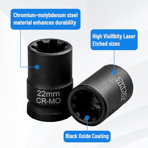 YSSNIUTOOL Conjunto de Zócalos de Impacto para Pinzas de Freno, Herramienta de Ajuste de Frenos de 1/2″ Drive Compatible con Audi Porsche VW BMW Ford 16 Piezas. Los zócalos de pinzas de freno YSSNIUTOOL están fabricados en acero cromo molibdeno, lo que garantiza que puedan soportar el alto par y estrés asociado con el mantenimiento de las pinzas de freno. Los pernos de montaje de las pinzas de freno a menudo tienen tamaños y formas únicas, lo que requiere una herramienta que coincida con las dimensiones específicas. Este conjunto maestro de zócalos de pinzas de freno es compatible con Audi VW BMW Benz Porsche, etc. Nuestro juego de eliminación de pinzas de freno YSSNIUTOOL incluye 16 tamaños diferentes de zócalos de pinzas de freno: 2x zócalos de 5 pt. (14 mm, 19 mm); 2x zócalos de 7 pt. (14 mm, 22 mm); 3x zócalos de 10 pt. (11,5 mm, 15 mm, 20 mm); 2x zócalos de spline (M10, M14, M18); 6x zócalos hexagonales (H7, H9, H11, H14, H17, H19). Conjunto especial de zócalos de impacto para pinzas de freno 1/2″ Square Drive Socket Wrench Brake Tool Kit Compatible con Audi/VW/Porsche/Benz/Ford/BMW. Hay 16 zócalos de impacto para pinzas de freno colocados dentro de la caja de embalaje, y el maletín es pequeño y compacto. Cada producto puede fijarse en la caja. Fácil de transportar, usar y almacenar. Nuestra herramienta para pinzas de freno está hecha de acero de cromo-molibdeno CR-MO de alta calidad, que tiene alta dureza, no se deforma ni daña, es resistente a altas presiones y tiene un buen rendimiento de absorción de impactos. Es resistente a la oxidación y a la corrosión, duradero y proporciona una vida útil más larga.