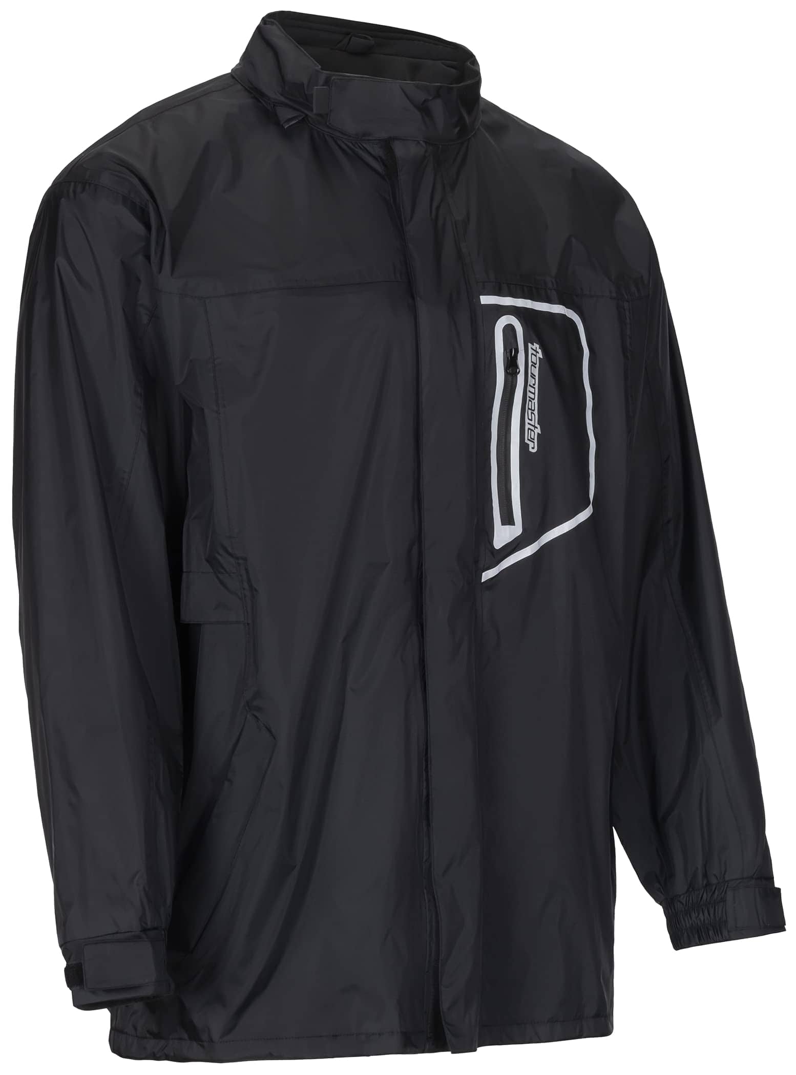 Concha de nylon con respaldo de poliuretano y costuras selladas. Forro de malla de poliéster tanto en la chaqueta como en los pantalones para mayor comodidad. Capucha Aqua-BarrierG � bajo el casco (Patente EE. UU. 8.156.573 y 7.779.485). Cuello forrado de microfibra con ajuste de gancho y lazo. Bolsillos de mano impermeables y bolsillo en el pecho, además de bolsillos delanteros y traseros en los pantalones. Orificios de ventilación en las axilas de la chaqueta. Los pantalones ofrecen superposiciones de poliéster en el asiento y las piernas internas para mayor durabilidad. Tirantes y trabillas de pierna desmontables. Banda elástica en la cintura y puños que aseguran un ajuste seguro. Impresión reflectante en la parte delantera y trasera de la chaqueta. Ribete reflectante en la pierna inferior de los pantalones.