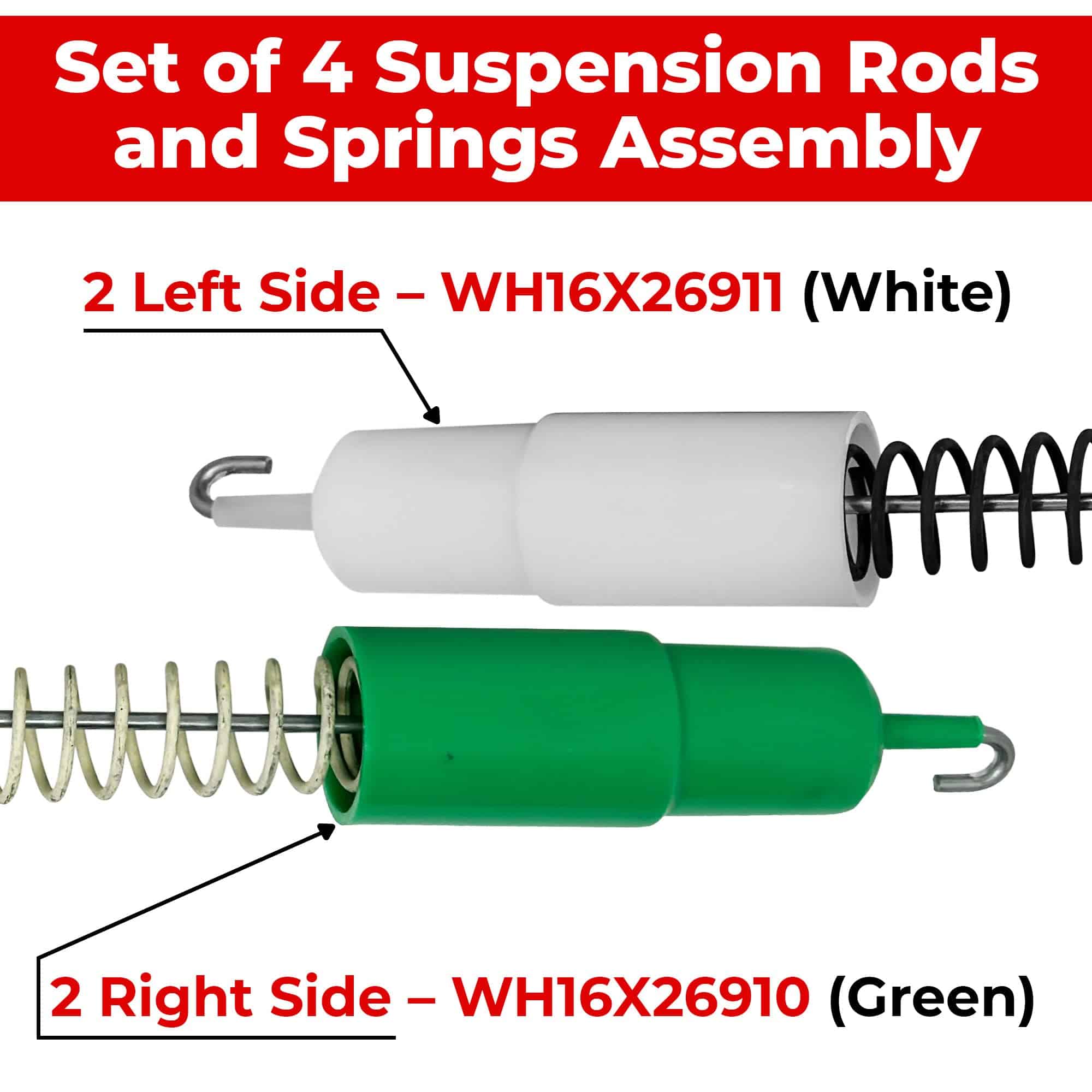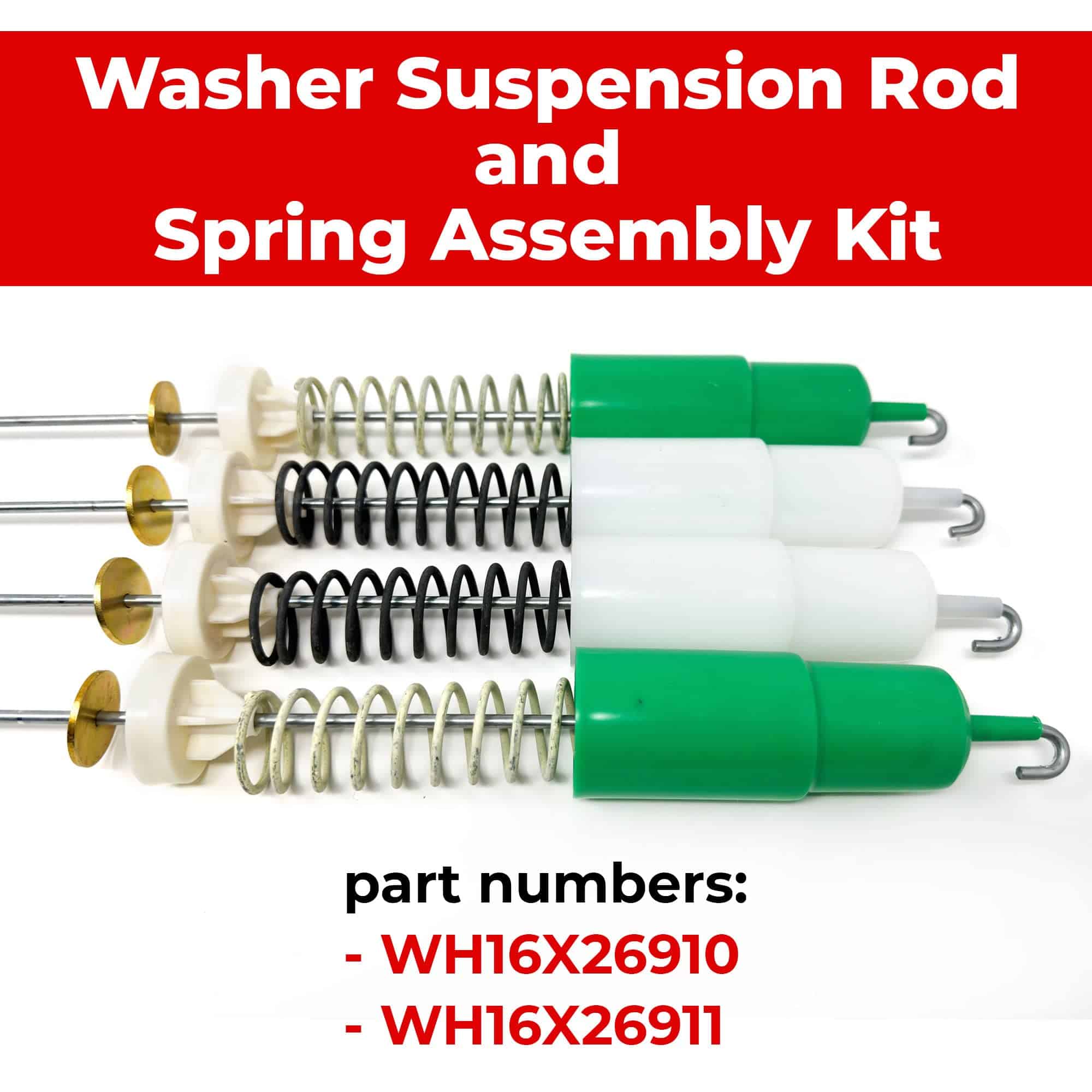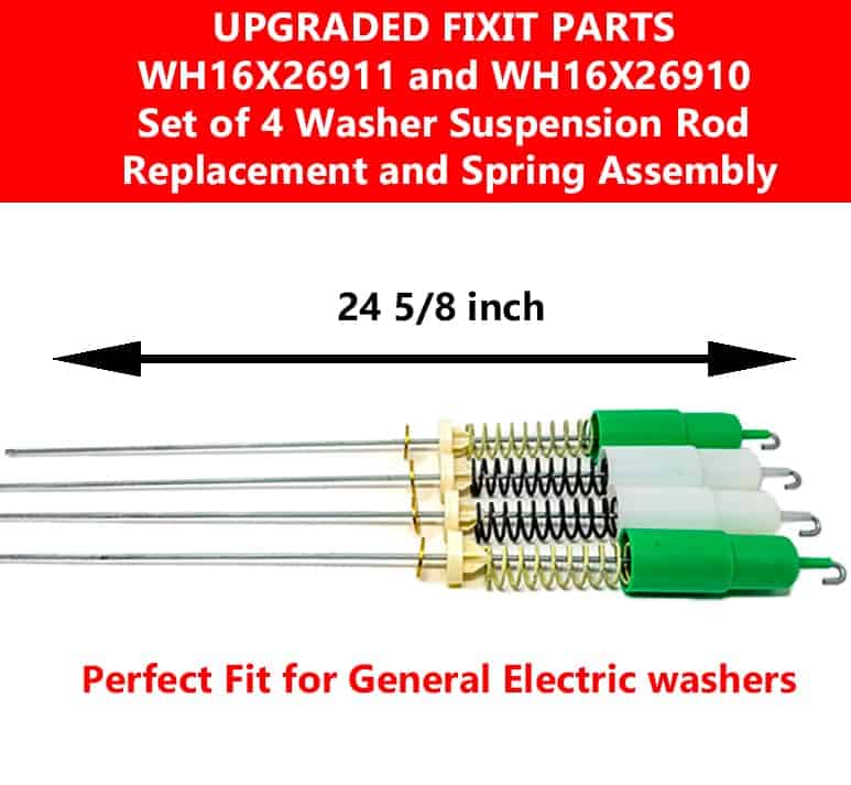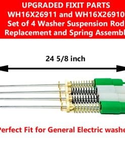 Este conjunto original de 4 varillas de suspensión de lavadora WH16X26911 y WH16X26910, junto con el kit de montaje de resortes, contiene 2 varillas de suspensión verdes y 2 varillas de suspensión blancas, cada una de 24.5/8 pulgadas de longitud. La varilla de suspensión actúa como un amortiguador para reducir la vibración y el ruido durante el ciclo de lavado de su lavadora. Las varillas de suspensión de alta calidad garantizan una estabilidad óptima y un funcionamiento suave de su lavadora. Este conjunto viene con una garantía de 1 año para su tranquilidad, respaldando la calidad y rendimiento del producto. Antes de realizar su pedido, contáctenos para asegurarse de la compatibilidad con el modelo específico de su lavadora. Nuestro equipo de soporte al cliente con conocimientos está disponible para ayudarlo y verificar que este conjunto sea el ajuste correcto para su electrodoméstico. Encuentre la compatibilidad de sus piezas fácilmente presionando la combinación de teclas adecuada en su dispositivo.
