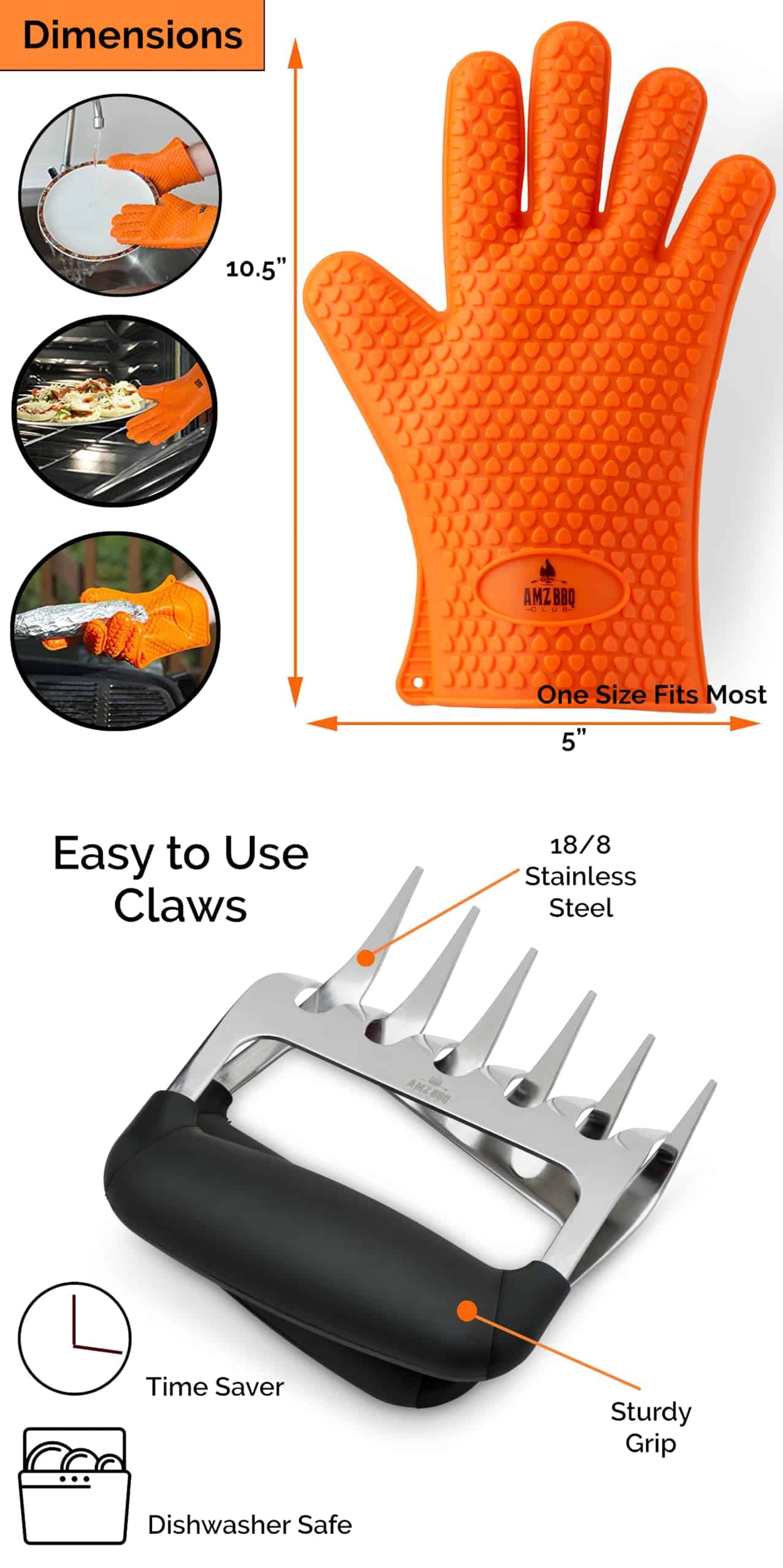 3. GUANTES VERSÁTILES: Nuestros versátiles guantes de silicona resistentes al calor son imprescindibles. La superficie texturizada antideslizante garantiza un agarre seguro, lo que los hace perfectos para levantar carne, pescado, verduras, sartenes para parrilla y ollas calientes. Ya sea que estés cocinando en interiores o exteriores, nuestros guantes son esenciales para manipulaciones seguras y fáciles. Limpiarlos es pan comido ya que son fáciles de limpiar y aptos para lavavajillas. ¡Prepárate para llevar tu juego de parrilla al siguiente nivel con estos resistentes y versátiles guantes!