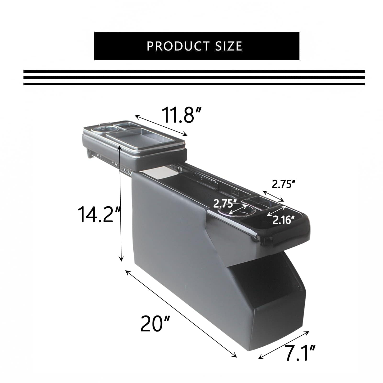 Compatibilidad: Adecuado para Minivans, SUVs, Consola de Van intermedia. Con dos portavasos: Esta consola central tiene dos portavasos. El diámetro del portavasos es de 2.75 pulgadas. Gran capacidad de almacenamiento: Cuenta con amplio espacio de almacenamiento para artículos pequeños como cuadernos de papel, útiles de escritura, cintas métricas y tarjetas de visita. Instalación fácil: No es necesario taladrar agujeros, solo instálalo entre dos asientos. Servicio postventa: Si tienes alguna pregunta, puedes contactarnos en cualquier momento, responderemos pacientemente a tu mensaje y resolveremos tu problema.