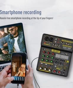 1. Mezcladora de Audio Profesional La mezcladora está equipada con ajuste de ganancia de entrada y graves altos, suministro de energía Phantom de 48V incorporado para alimentación directa de micrófono de condensador, puerto de salida de auriculares de alta definición, reproducción de MP3, WMA, WAV, FLAC, dispositivo con tarjeta de sonido se puede conectar directamente a la PC.