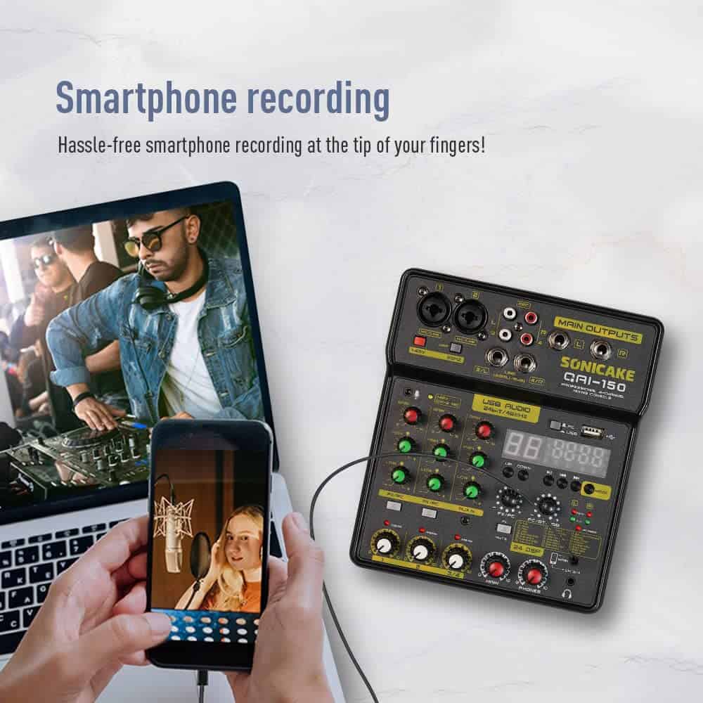 2. Función Bluetooth Capacidad de transmisión de audio inalámbrica sin cables directamente a la unidad de consola. Mezcla tu iPad, iPhone, teléfono inteligente Android a tu sesión de DJ. Esta mezcladora de audio facilita la transmisión inalámbrica de todas tus canciones favoritas al tablero de mezcla fácilmente.