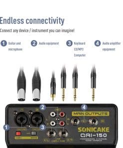 4. Entradas de Micrófono y Línea Estéreo Soportando XLR y enchufe desbalanceado de 1/4″ con botón Phantom de +48V, indicador de nivel de pico LED altamente preciso y ecualizador de 3 bandas ultra musical en todos los canales. Mezcladora de ultra bajo ruido, gran área de trabajo y súper fácil funcionalidad para sonido vocal e instrumental profesional.