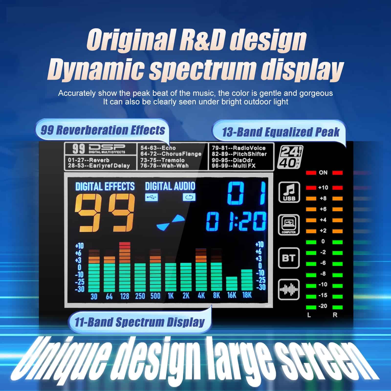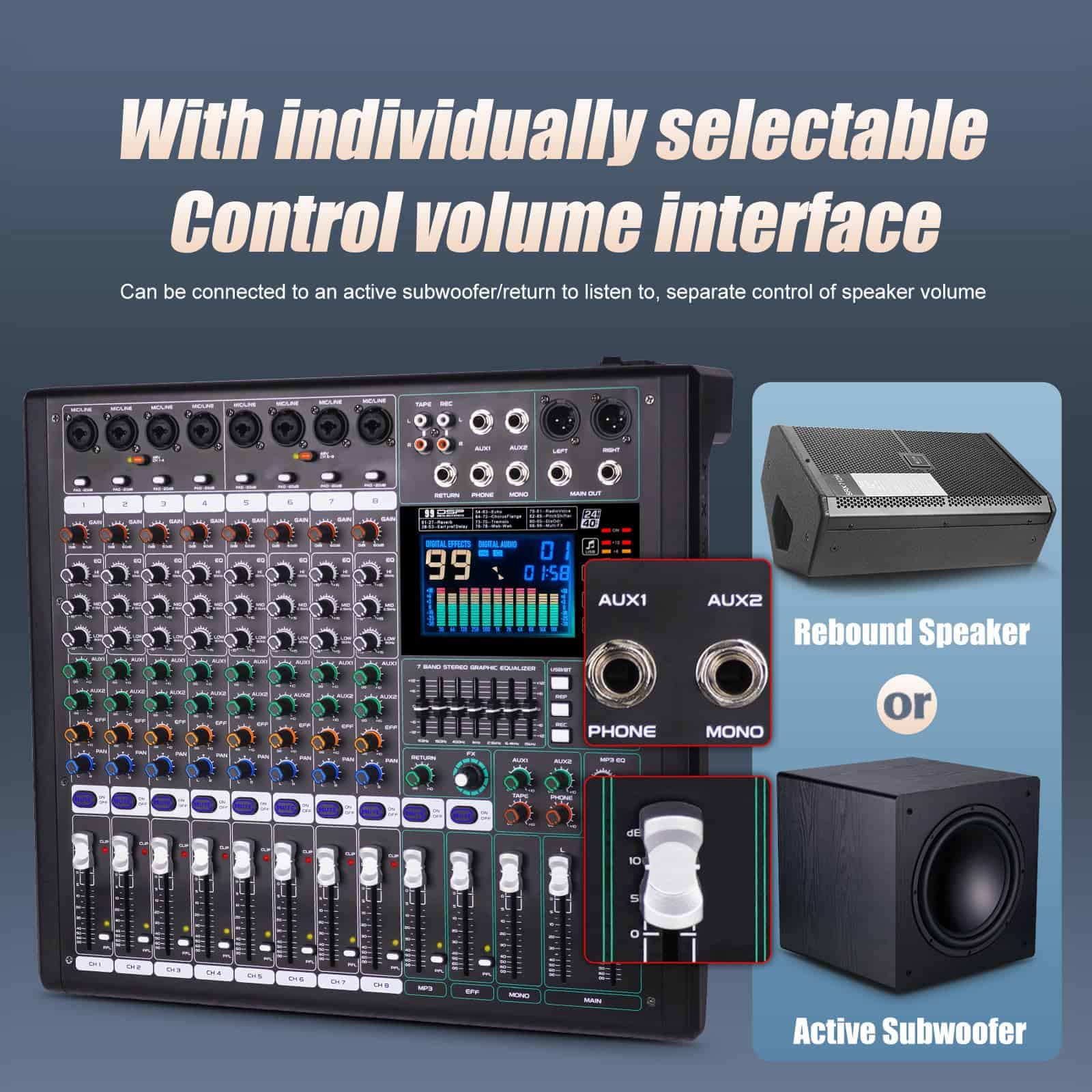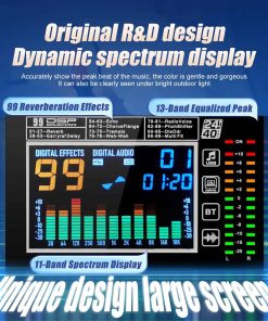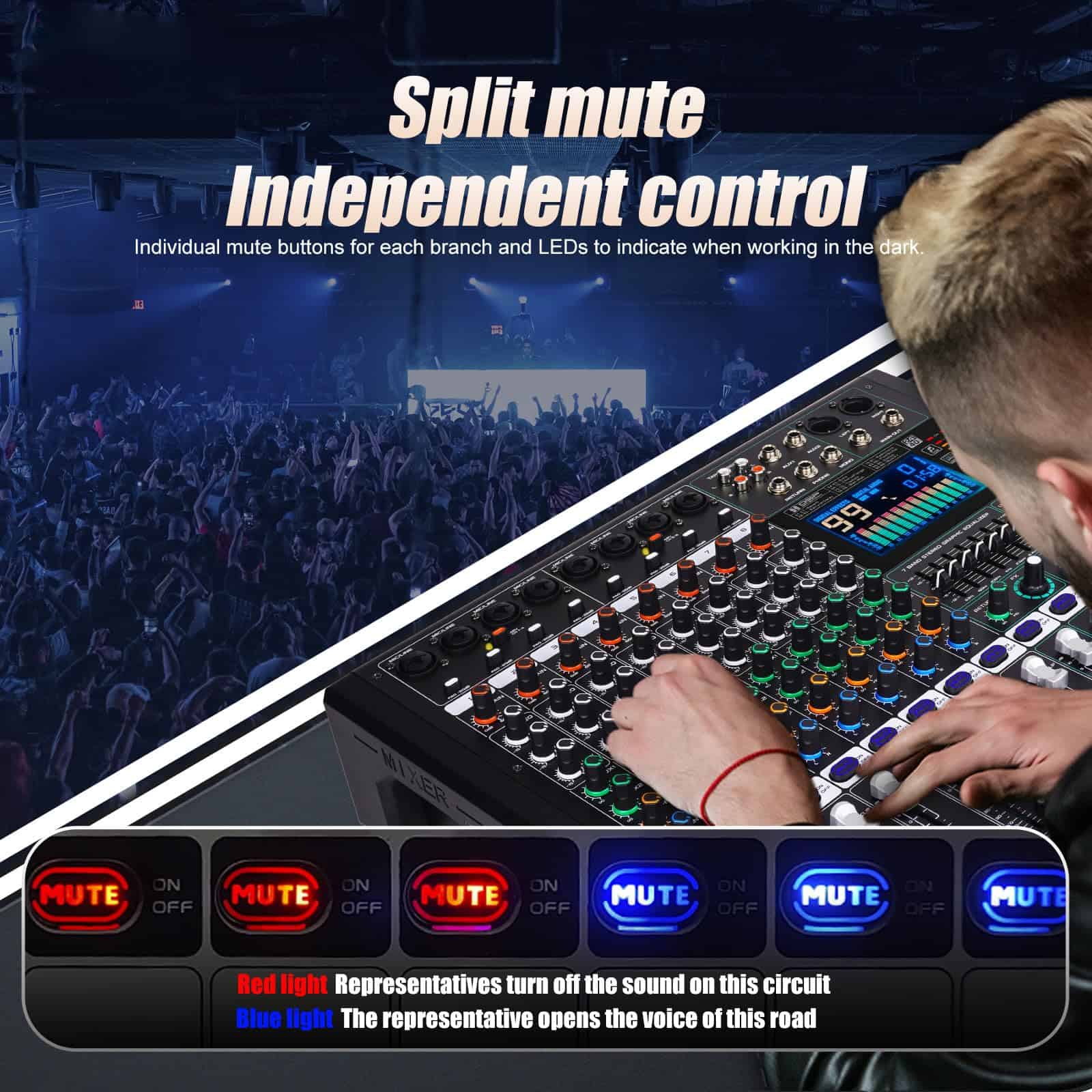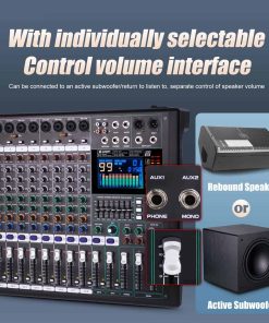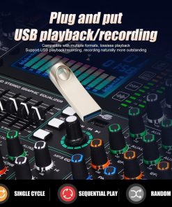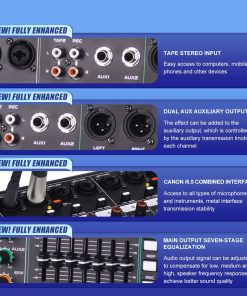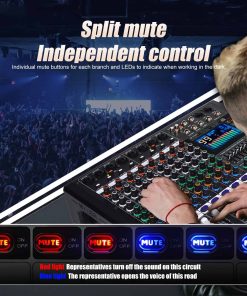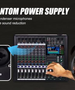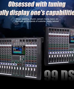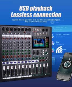 1. MEZCLADOR: El mezclador de 8 canales se refiere a dispositivos con 8 canales de entrada de audio separados. Estos canales permiten a los usuarios acceder a múltiples fuentes de audio como micrófonos, instrumentos u otros dispositivos de audio y mezclar, equilibrar y procesar a través del sintonizador. 2. Cada canal generalmente está equipado con control de ganancia preestablecido, control de balance de audio, EQ (ecualizador), efectos de envío (como reverberación o retardo), control de volumen del canal, etc. 3. Controlador de ecualizador de 7 etapas eficiente y muy musical para ajuste total de volumen, que puede ajustar el volumen de manera más fina, proporcionar calidad de sonido más precisa, clara y clara. 4. Procesador de efectos DSP de 99: puede cambiar al efecto DSP correspondiente de 99 para adaptarse a más escenarios diferentes, este increíble mezclador multiusos es perfecto para actuaciones en directo, espectáculos en vivo y el sentido de las fiestas. 5. (Función USB/Bluetooth): los dispositivos de almacenamiento USB pueden conectarse para su uso; la conexión Bluetooth es simple y rápida; el mezclador puede reproducir música cuando está conectado, y la pantalla a color LCD es clara y clara. 6. Uso multifuncional: adecuado para ocasiones pequeñas a medianas, como pequeñas actuaciones, estudios, radio, etc.