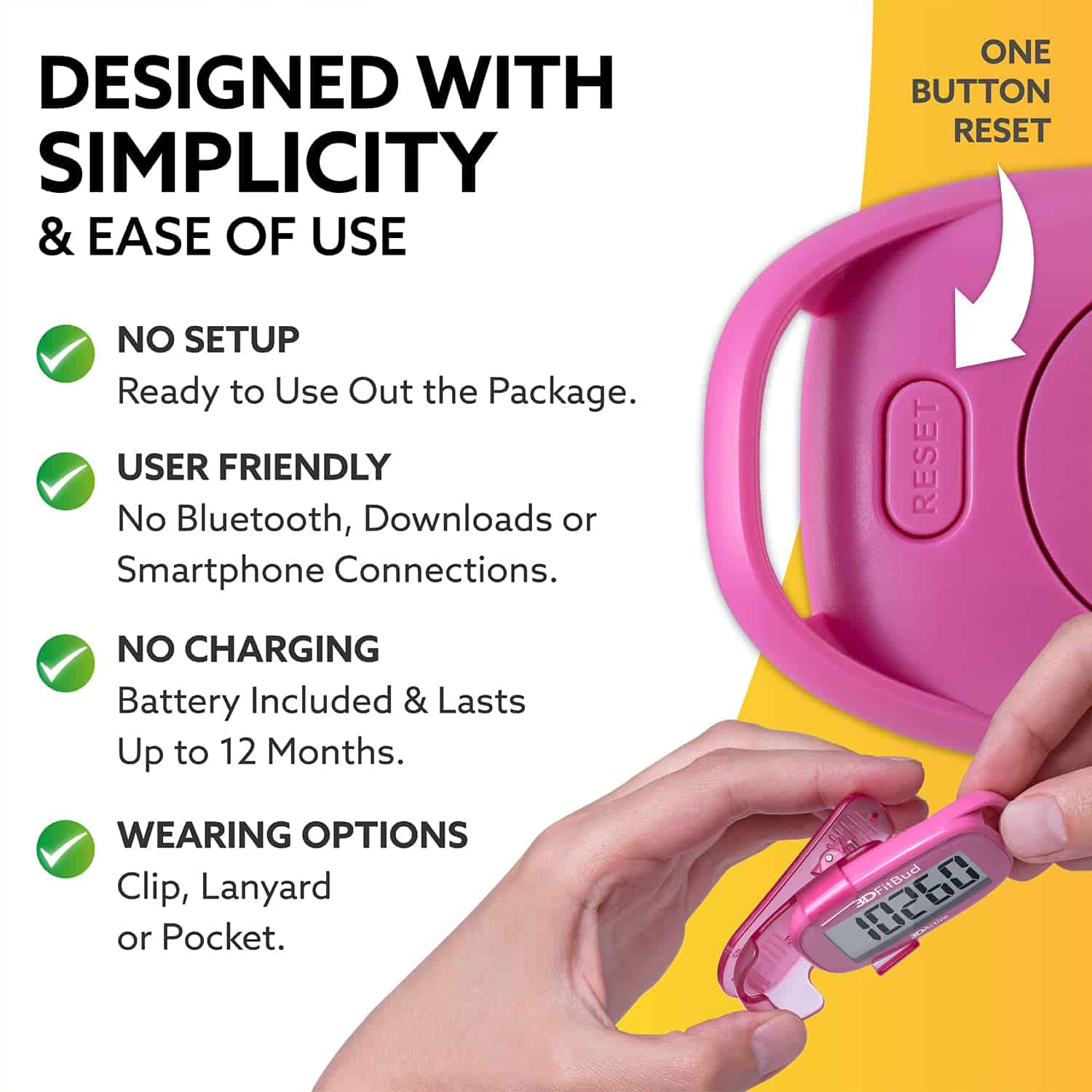 2. SIGA SUS PASOS DIARIOS: Creado con simplicidad pero cuenta eficazmente sus pasos para que pueda seguir viendo su progreso en movimiento motivándolo más para alcanzar su objetivo de fitness. No más programas complicados, simplemente presione el botón en la parte posterior para comenzar.