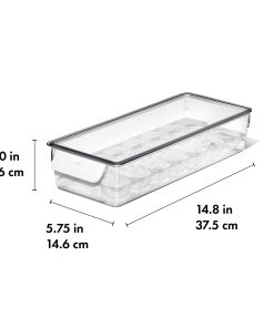 El Sistema de Organización de Refrigeradores OXO Good Grips es una extensa colección de contenedores, cajones, estantes, elevadores y accesorios para ayudar a organizar tu refrigerador. ¡Nunca te quedes sin huevos de nuevo con nuestro Contenedor de Huevos con Bandeja Extraíble! Este resistente accesorio puede guardar hasta 20 huevos frágiles con espacio para apilarlos. El contenedor transparente y la tapa los mantienen seguros, permitiéndote vigilar cuándo necesitas reponer. La bandeja de huevos extraíble permite una limpieza fácil y completa de cualquier derrame, mientras que la tapa añade una capa adicional de protección. El contenedor de huevos tiene mangos redondeados para un agarre cómodo y se desliza suavemente dentro y fuera del refrigerador cuando lo necesitas. Mide 5.75 in x 14.8 in x 3 in/14.6 cm x 37.6 cm x 7.62 cm y solo se lava a mano.