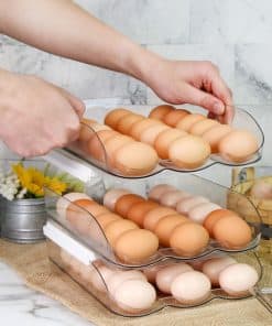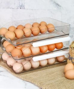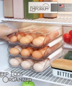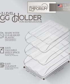 Cuando tienes una familia grande pareciera que estás alimentando a un pequeño ejército. Dos huevos al día para el desayuno cuando tienes una familia de 6 significa que la mitad de tus estantes de la nevera están ocupados por cartones de huevo. Ya no más. Con el Contenedor de Huevos de Plástico Transparente de Gran Capacidad de Creekview Home Emporium para Refrigerador puedes recuperar tu espacio en el estante. El diseño de 3 cajones apilables tiene una capacidad máxima de 48 huevos. Cuando está completamente ensamblado, tu almacenamiento de huevos mide 8.46 x 11.2 x 8.26 pulgadas (21.5 x 28.5 x 21 cm) y se puede desenganchar para usar individualmente a medida que se consume tu suministro. El estante superior rígido se puede apilar para aumentar la capacidad total de la nevera. Perfecto para almacenar huevos frescos de granja en el mostrador también cuando tus gallinas te están dando un festín. Advertencia: Este producto puede exponerte a químicos que se sabe en el Estado de California que causan cáncer y defectos de nacimiento u otros daños reproductivos