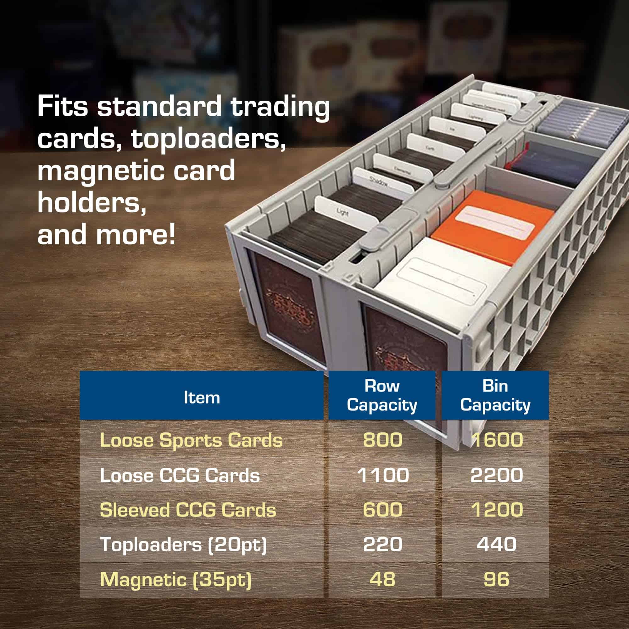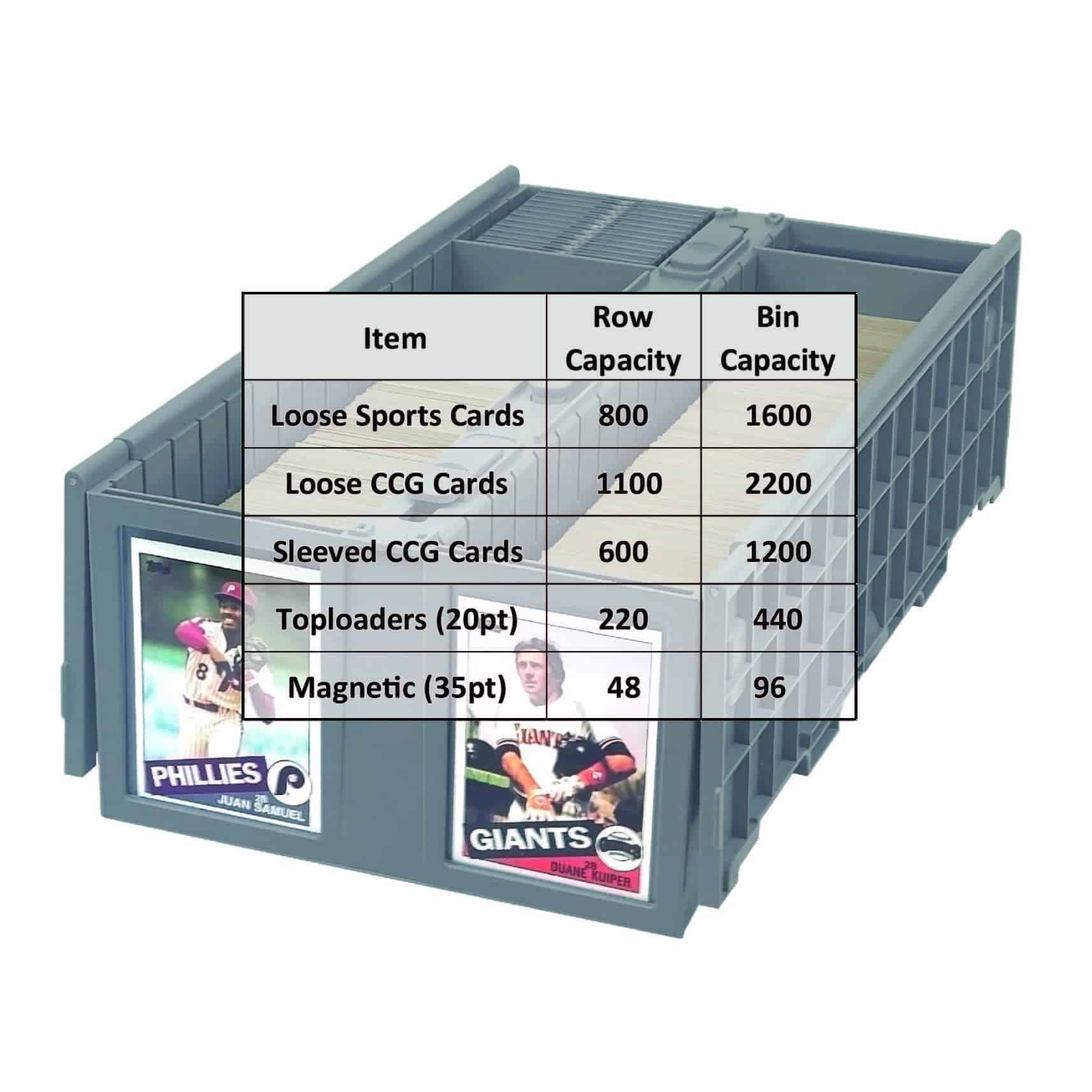 El contenedor de tarjetas también viene con un par de toploaders BCW que encajan en ranuras especiales exteriores para ayudar a marcar el contenido de cada fila.