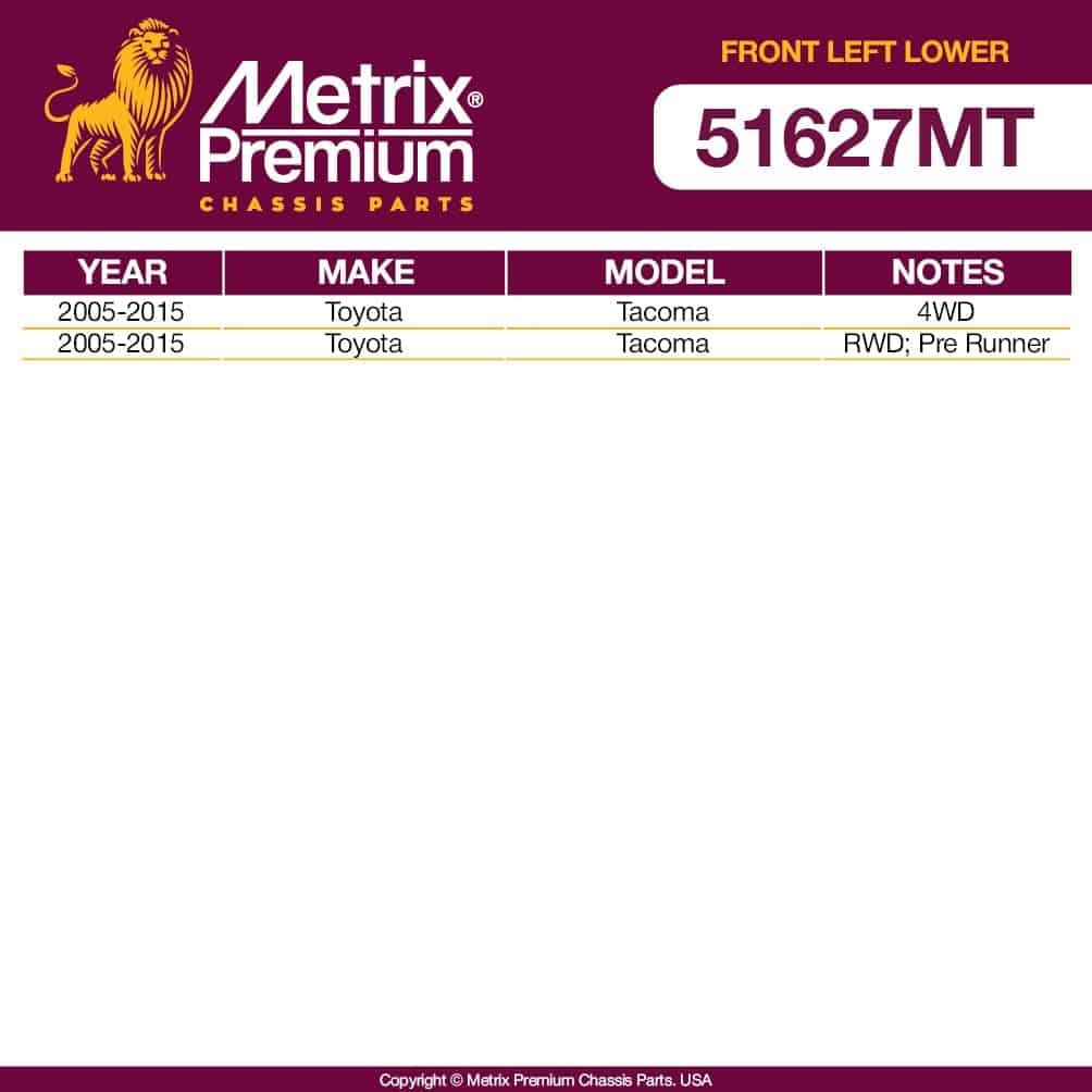 Diseñados de acuerdo con todos nuestros valores fundamentales, que es producir productos que igualen o superen el rendimiento de calidad OEM, los brazos de control METRIX PREMIUM cumplirán todas tus expectativas al reemplazar partes críticas de seguridad. Esta pieza te dará el ajuste a la primera que estás buscando. Una pieza de calidad premium suministrada con todos los accesorios necesarios requeridos que te brindarán tranquilidad y un producto que te permitirá completar una instalación sin estrés