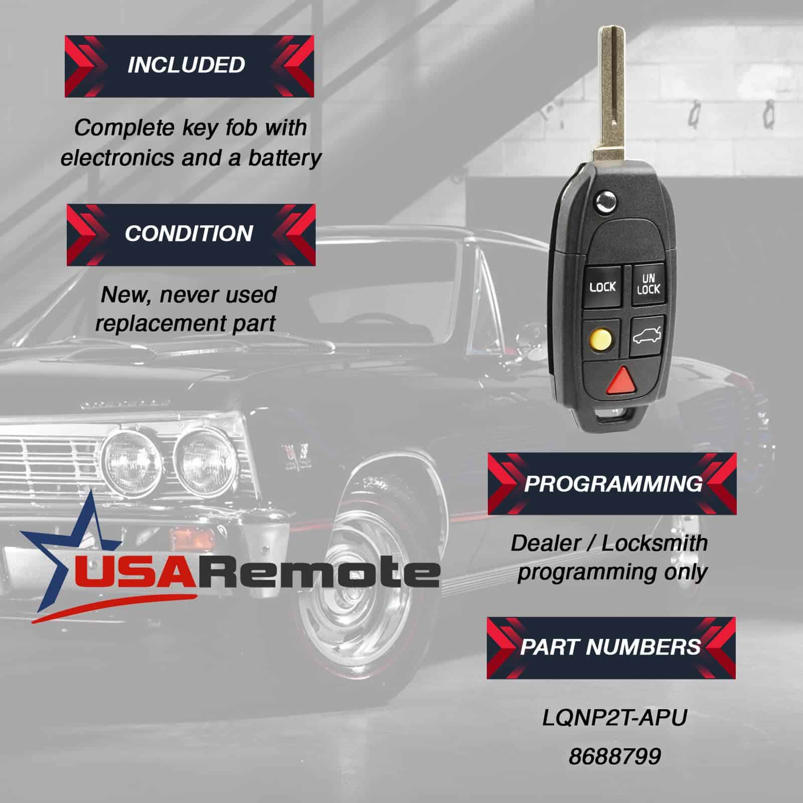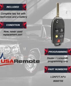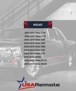 Control remoto de entrada sin llave con tapa plegable que se ajusta a varios modelos de vehículos Volvo, incluyendo C30, C70, S40, S60, S80, V50, V70, XC60, XC70 y XC90. Este control remoto ofrece comodidad y seguridad al permitirle acceder a su vehículo de forma rápida y segura. Modelo: LQNP2T-APU.