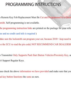 4. PROGRAMACIÓN: Este Control de Proximidad debe ser cortado y programado por un cerrajero calificado. Nota: Asegúrese de que el cerrajero pueda programar su automóvil, ya que los Jeep 2018+ requieren remover la ECU para leer el código PIN (NO SE RECOMIENDA LA CONCESIONARIA DE AUTOS). Este Transmisor solo funciona en vehículos con botón de arranque.
