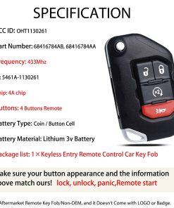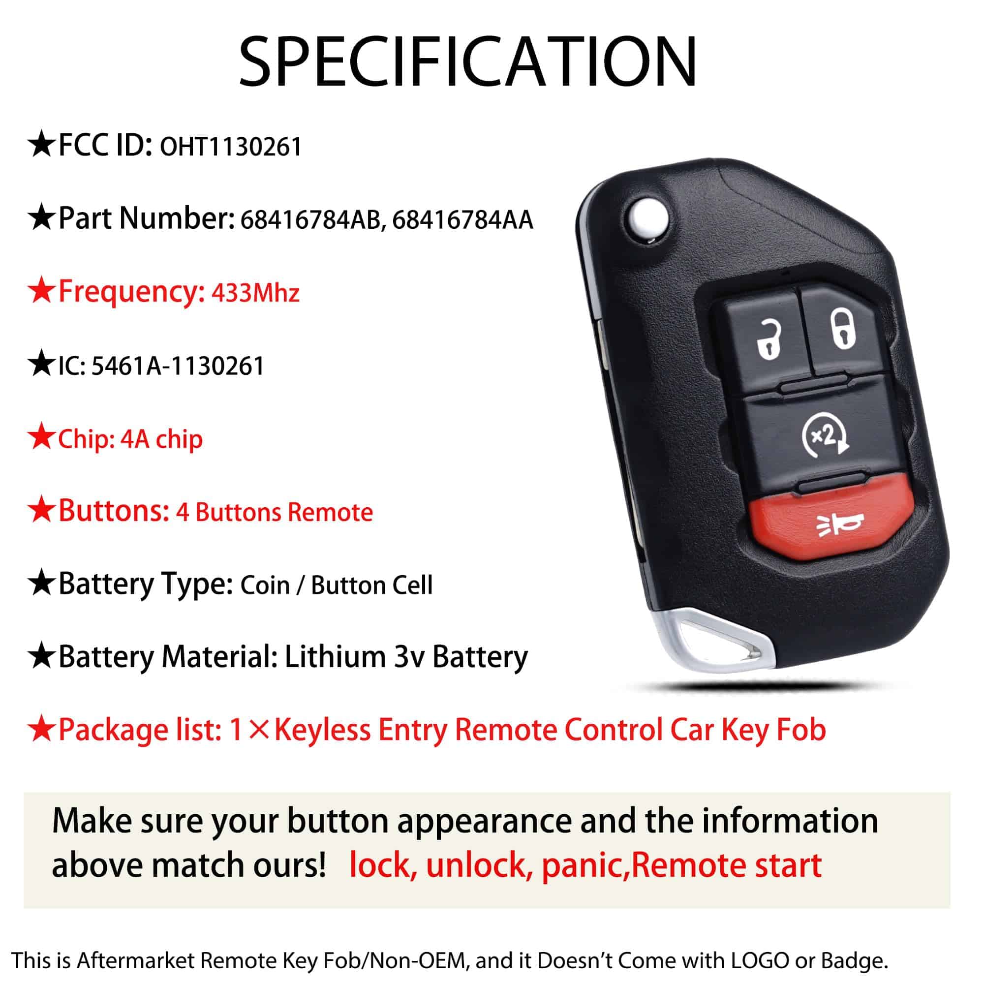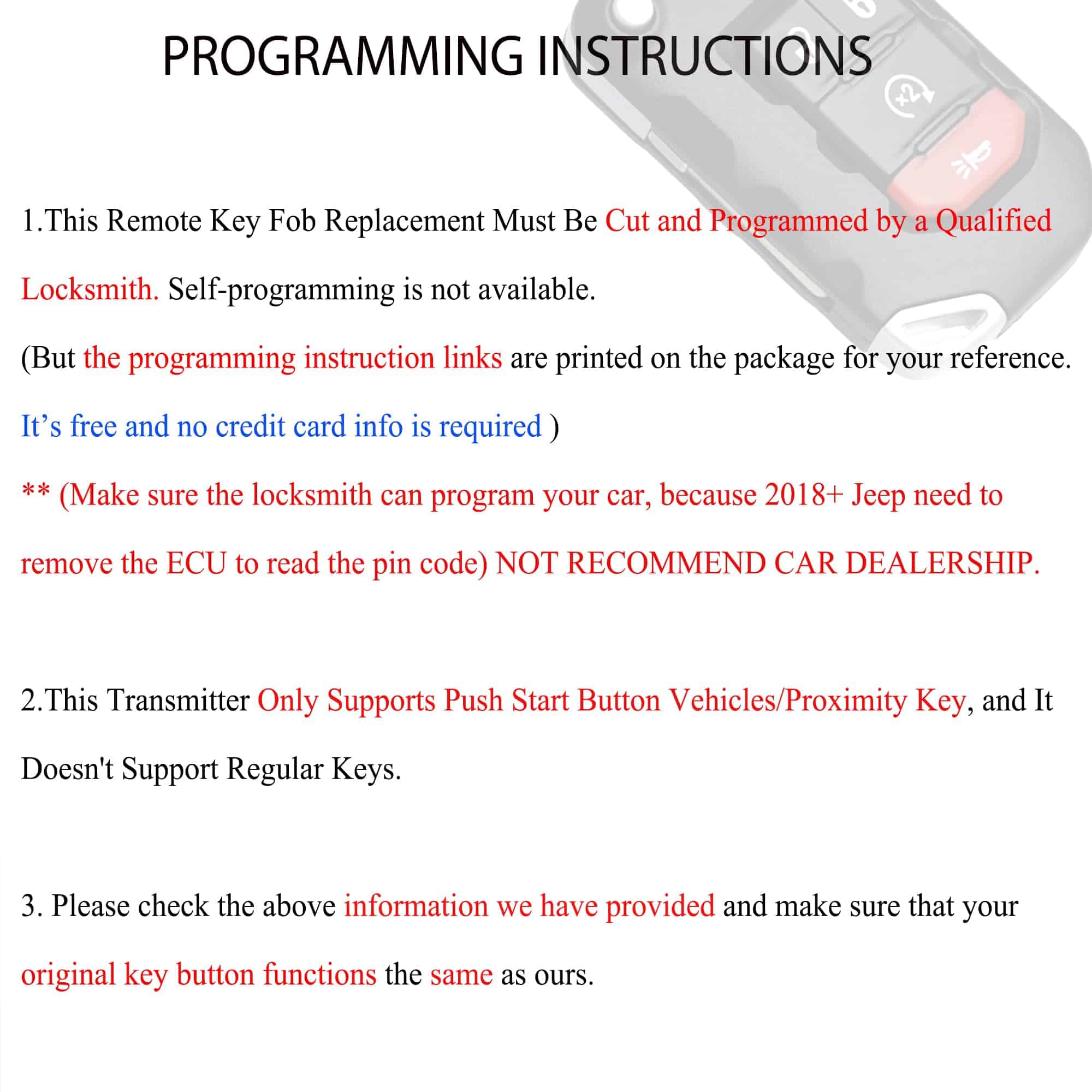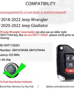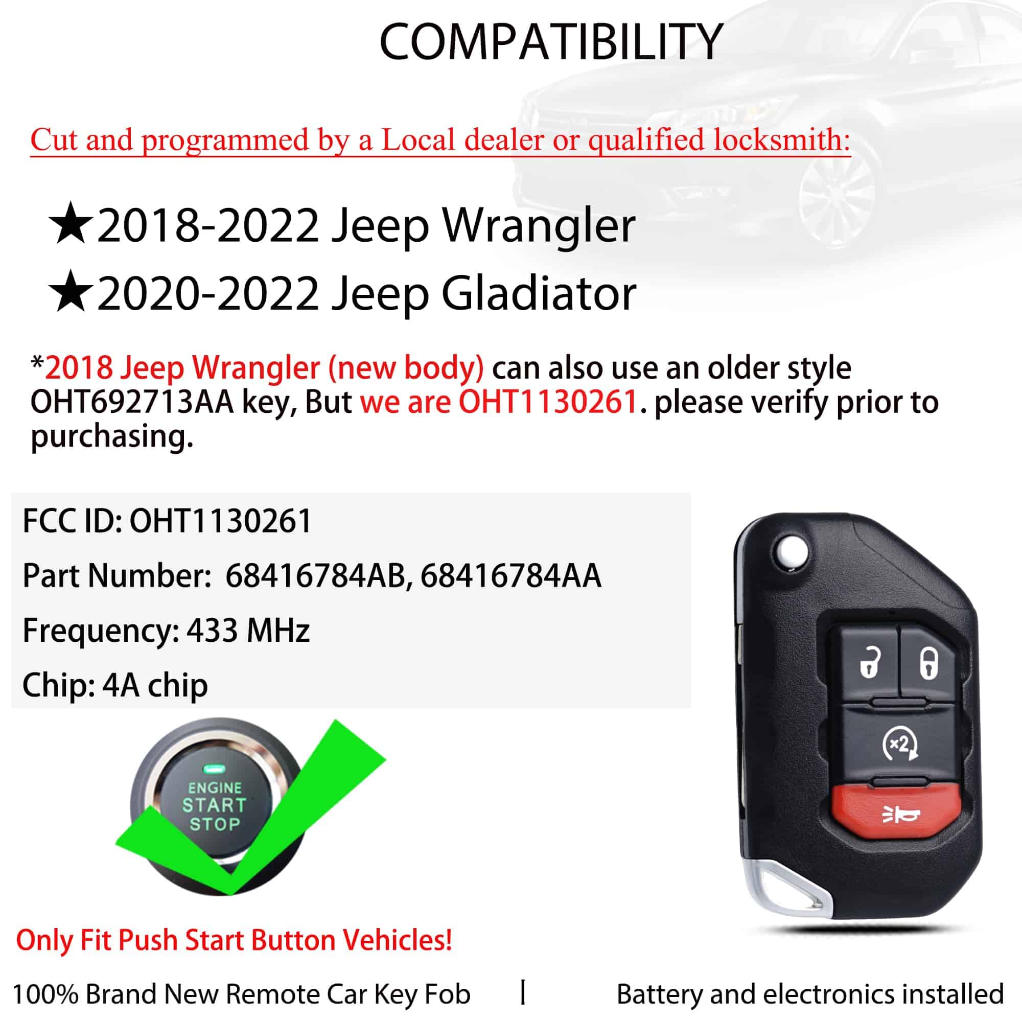 1. REPUESTO: Este Control Remoto de Llavero de Repuesto es compatible con el Jeep Wrangler 2018-2022 / Jeep Gladiator 2020-2022, por favor verifique nuestra herramienta de compatibilidad de vehículos para ver la lista completa de vehículos compatibles.