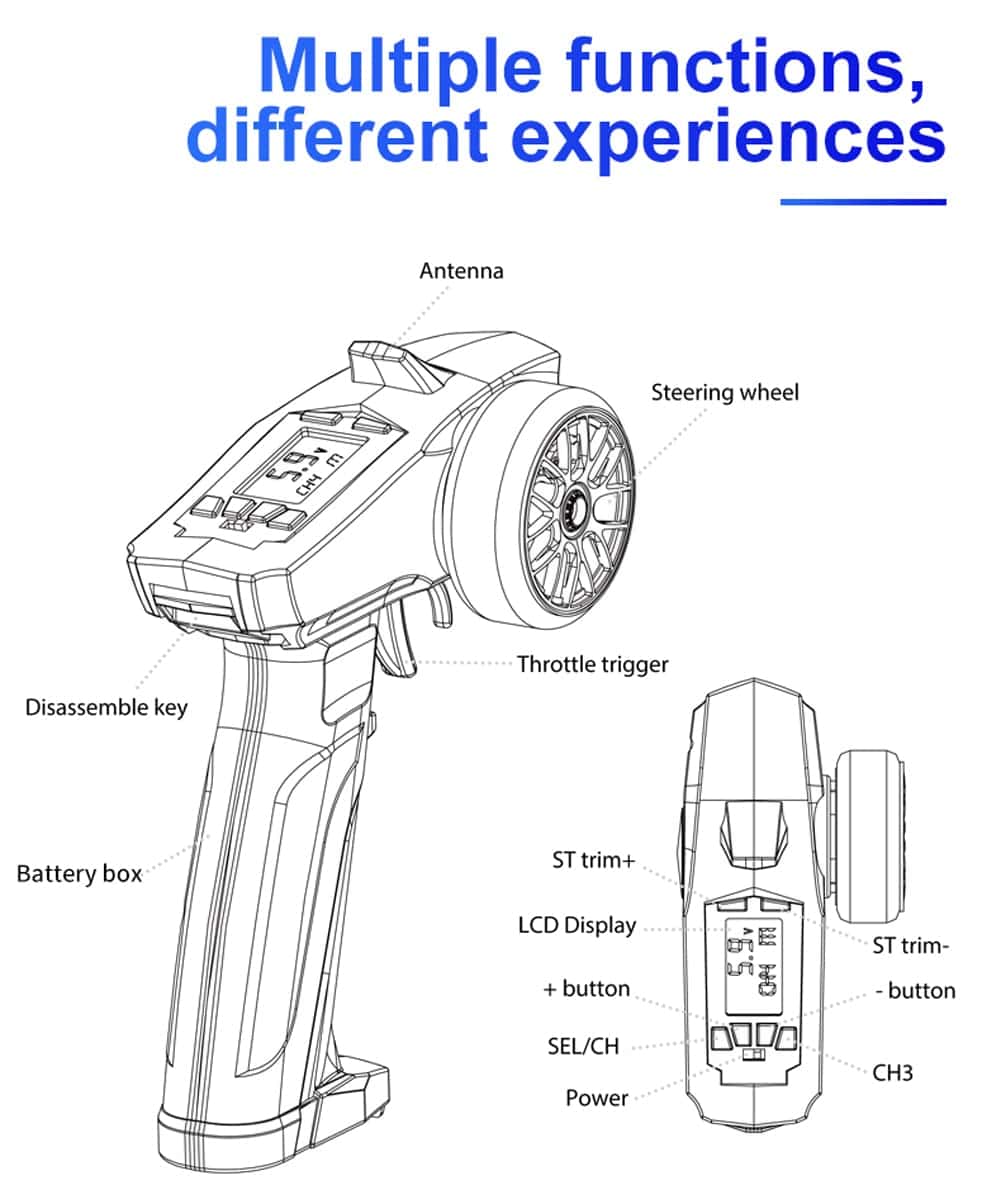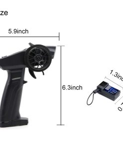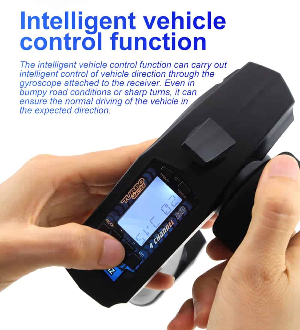 Marca: Turbo Racing Modelo: P32 91803G-VT Nombre del artículo: Transmisor Color: Negro Tamaño del producto: El control remoto mide 137 x 162.3 x 68.6 mm Peso del producto: El control remoto pesa aproximadamente 129 g Peso del embalaje: Aproximadamente 226 g (con caja) Aplicación: Modelos de vehículos de coches RC y barcos Especificaciones: Nombre del modelo: P32 Canal: 4CH Memoria de modelo: 15 modelos Voltaje de entrada: 6V DC 4 pilas AAA de 1.5V (no incluidas) Distancia remota: Aproximadamente 120 m Alarma de batería baja: Inferior a 4.5v D/R: Acelerador y dirección Función ABS: Sí Configuración EXP: Sí REV: Canal completo EPA: Canal completo Función de ajuste de recorte: Sí Paquete incluido: 1 Control remoto P32 1 Receptor gyro RX49 4CH