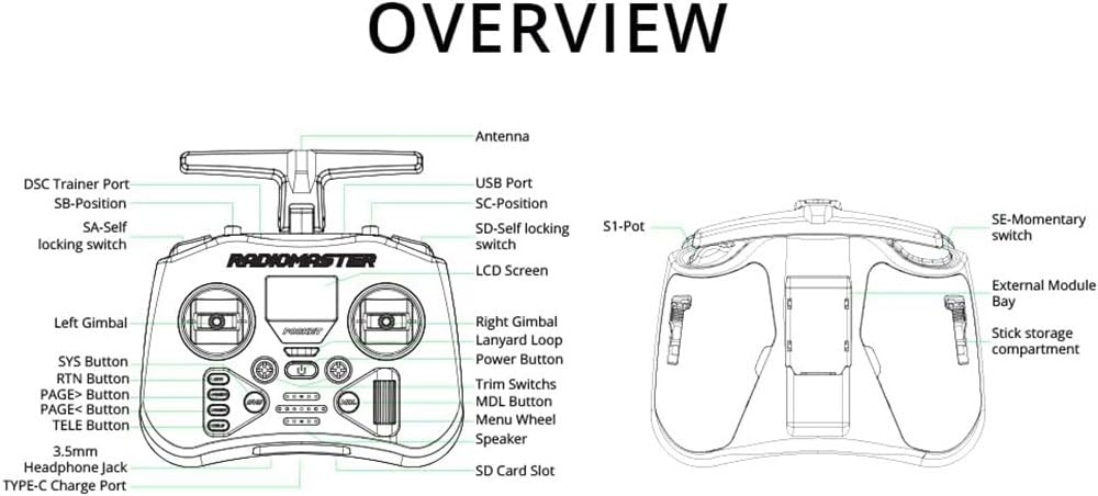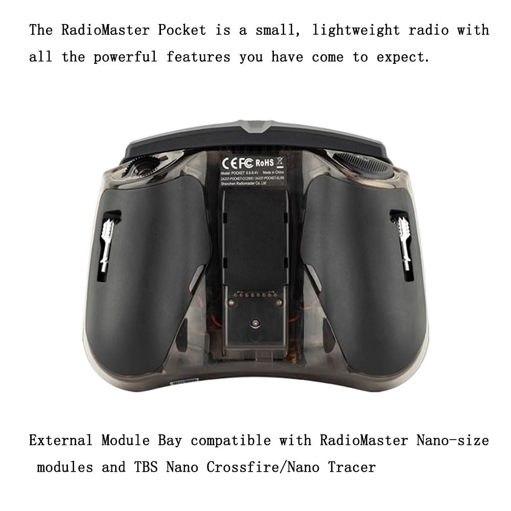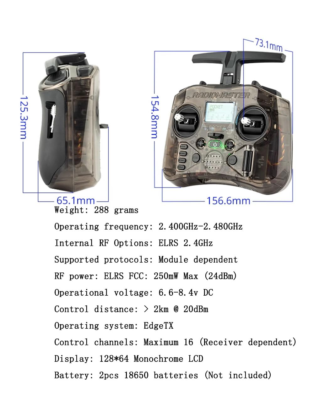 5. Sistema operativo: EdgeTX. Canales de control: Máximo 16 (dependiente del receptor). Pantalla: LCD monocromática 128×64. Firmware actualizable: A través de USB o la tarjeta SD incluida. Gimbal: Efecto Hall