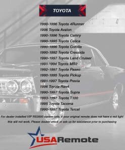 Este control remoto sin llave es compatible con los sistemas instalados por el concesionario de Toyota. Es ideal como reemplazo o como repuesto adicional. Fácil de programar y usar. ¡Obtenga el control total de su vehículo con este práctico control remoto!