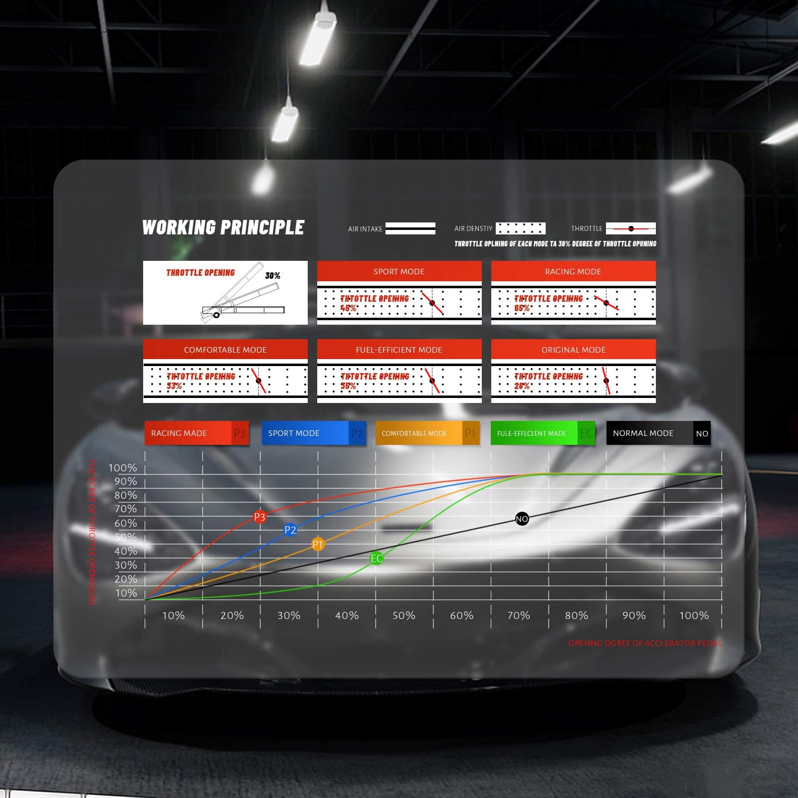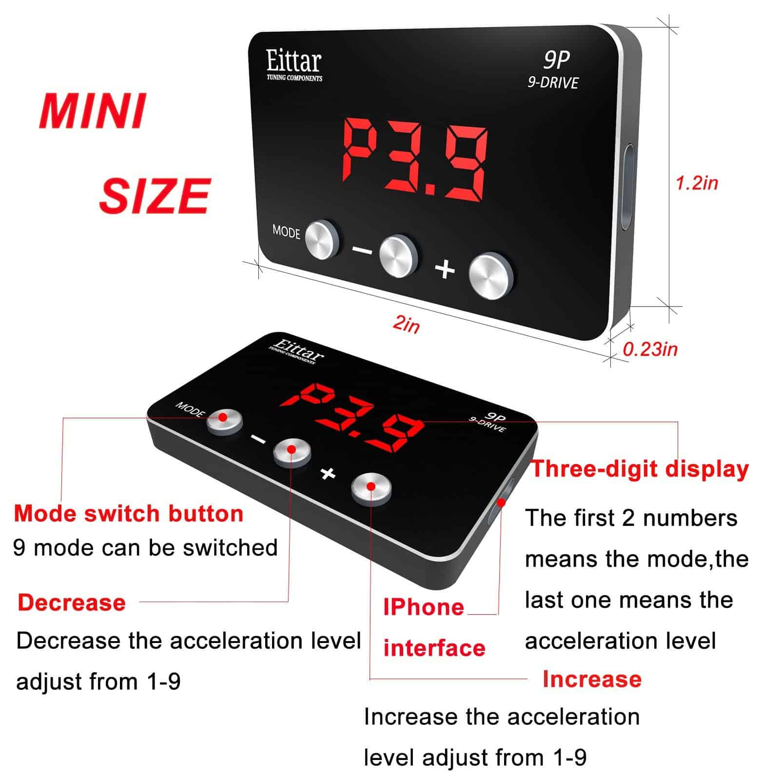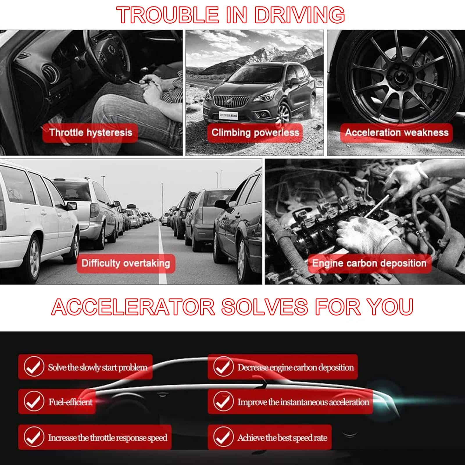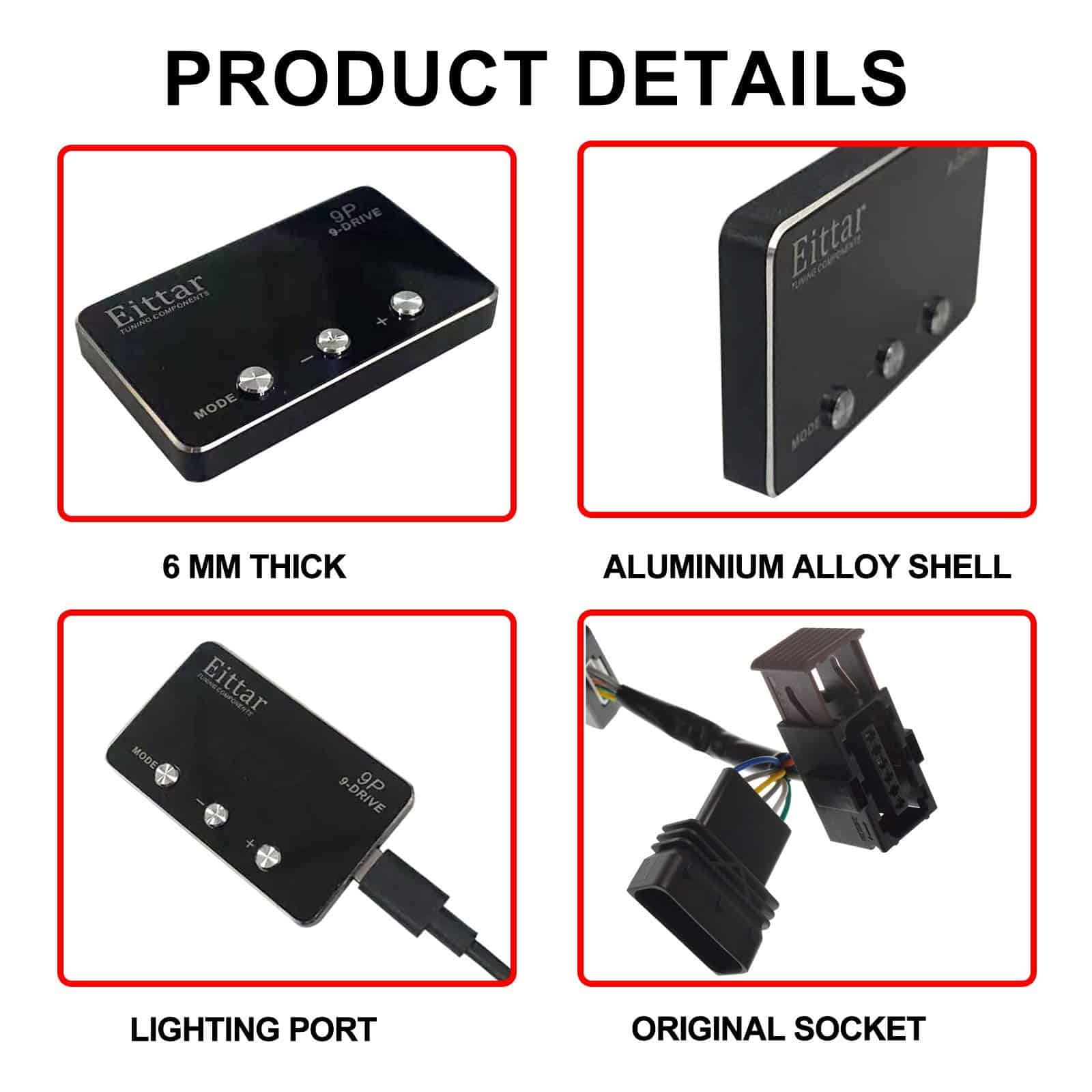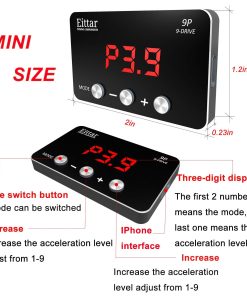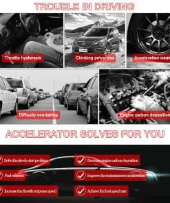El Controlador de Acelerador Electrónico es un potenciador que controla la apertura del acelerador del automóvil para mejorar la experiencia de conducción y adaptarse a diferentes hábitos de conducción. Resuelve el inicio lento, aumenta la velocidad de respuesta del acelerador, mejora la aceleración instantánea, disminuye la deposición de carbono del motor y evita que el vehículo avance repentinamente. Logra la mejor eficiencia de combustible para adaptarse a las diferentes situaciones de conducción. Viene con cinco modos: Modo Confort (aumenta la velocidad de respuesta del acelerador en un 15%), Modo Deportivo (mejora la aceleración instantánea y las habilidades de giro en un 45%), Modo Carreras (logra un rendimiento de aceleración superior en un 60%), Modo Eficiente en Combustible (ahorra un 3%-8% de combustible) y Modo Normal (vuelve al modo de control normal). Fácil de instalar en automóviles con acelerador electrónico. Por favor, asegúrese de que su automóvil tenga un acelerador electrónico con enchufe, ya que nuestro producto no es compatible con aceleradores mecánicos. La instalación es rápida y sencilla siguiendo el manual del usuario o las fotos de instalación.